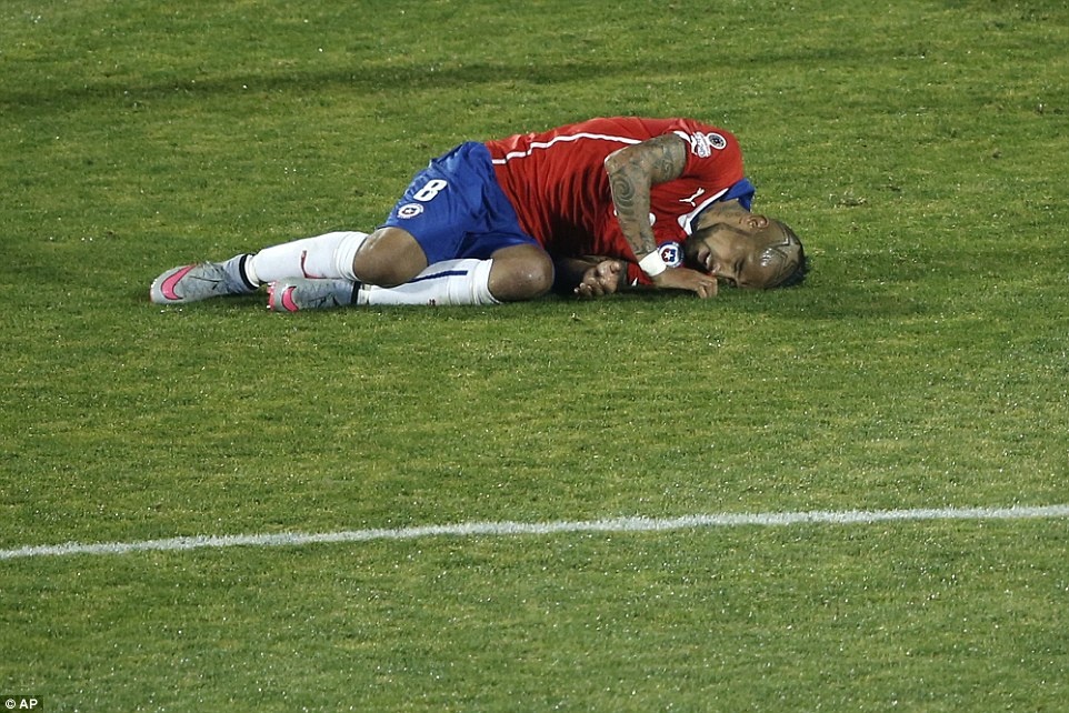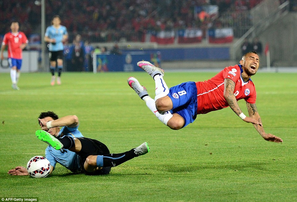 | Tiền vệ Arturo Vidal trở thành mục tiêu phạm lỗi của các cầu thủ Uruguay trong 45 phút đầu tiên. |