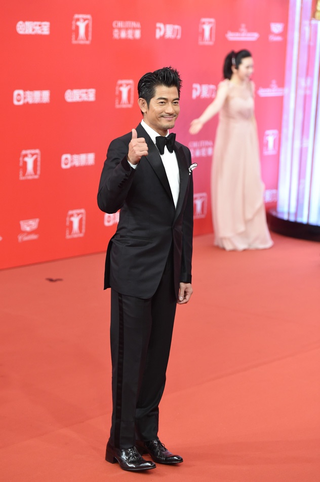 | Tạ Đình Phong đeo kính mát trên thảm đỏ. Anh đến một mình thay vì đi cùng Vương Phi. |