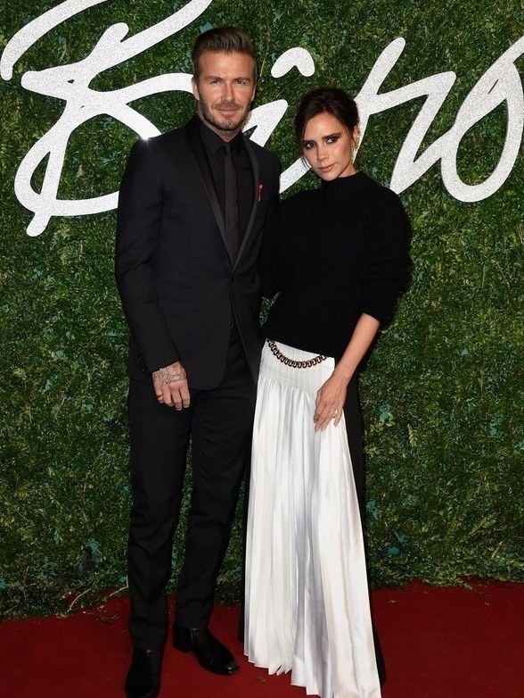 | Vợ chồng David Beckham sánh đôi trên thảm đỏ tại lễ trao giải. Trong khi Beckham lựa chọn một bộ suit màu đen thanh lịch, Victoria diện trang phục tông màu đen trắng nằm trong BST thời trang của chính mình. |