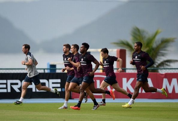 | Dàn sao tuyển Anh chạy thả lỏng trước khi kết thúc buổi tập trên sân của trung tâm huấn luyện Urca tại Rio de Janeiro. |