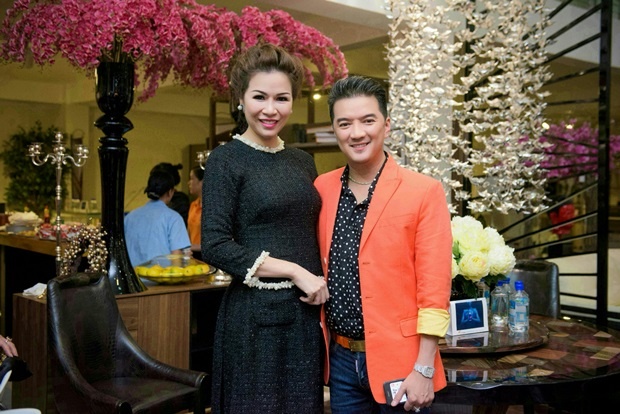 | Tối 14/12, Hoa hậu Quý bà Bùi Thị Hà có mặt khai trương showroom Ashley tại số 1A Phạm Hùng, quận Cầu Giấy, Hà Nội. Ca sĩ Đàm Vĩnh Hưng mặc trang phục cam nổi bật vui mừng hội ngộ Bùi Thị Hà. |