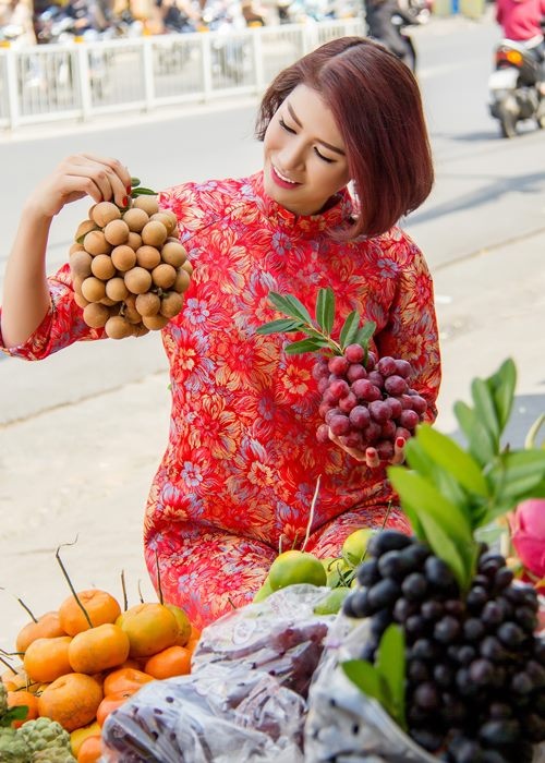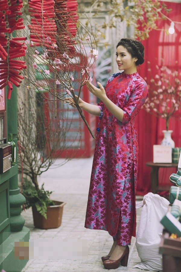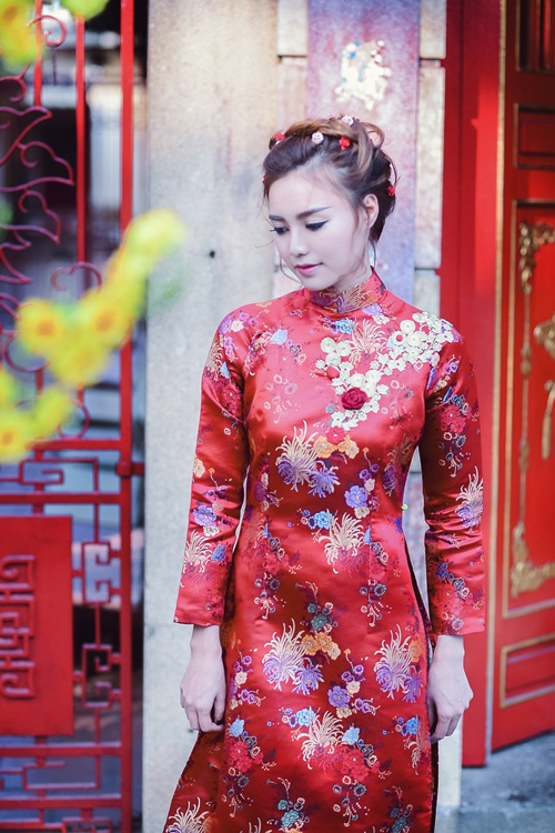| Bắt nhịp xu hướng truyền thống, diễn viên Ninh Dương Lan Ngọc biến hóa sinh động với kiểu áo dài gấm tông đỏ, tượng trưng cho sự may mắn, tài lộc đầu năm mới. Người đẹp phim Cánh đồng bất tận để tóc tết và tông trang điểm nhẹ nhàng. |