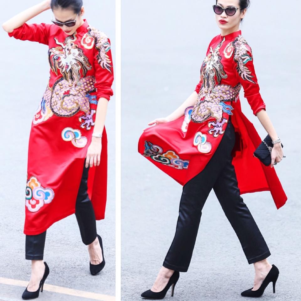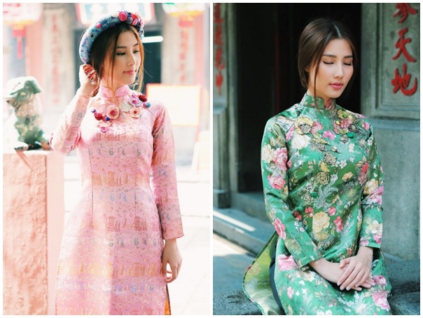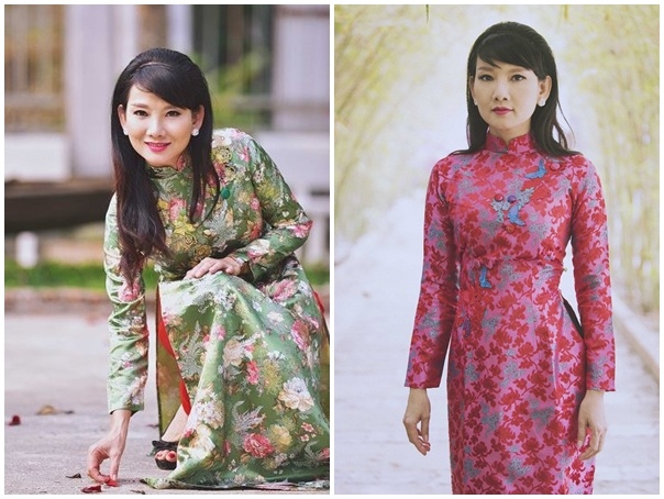 Áo dài gấm họa tiết của NTK Thủy Nguyễn được nhiều người đẹp Vbiz ưa chuộng, chọn mặc trong thời gian qua.