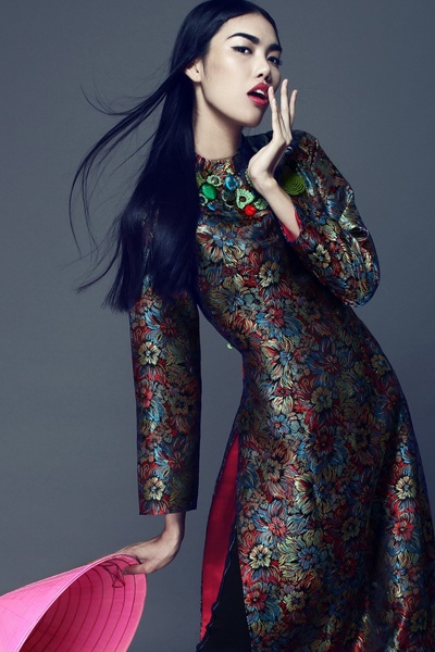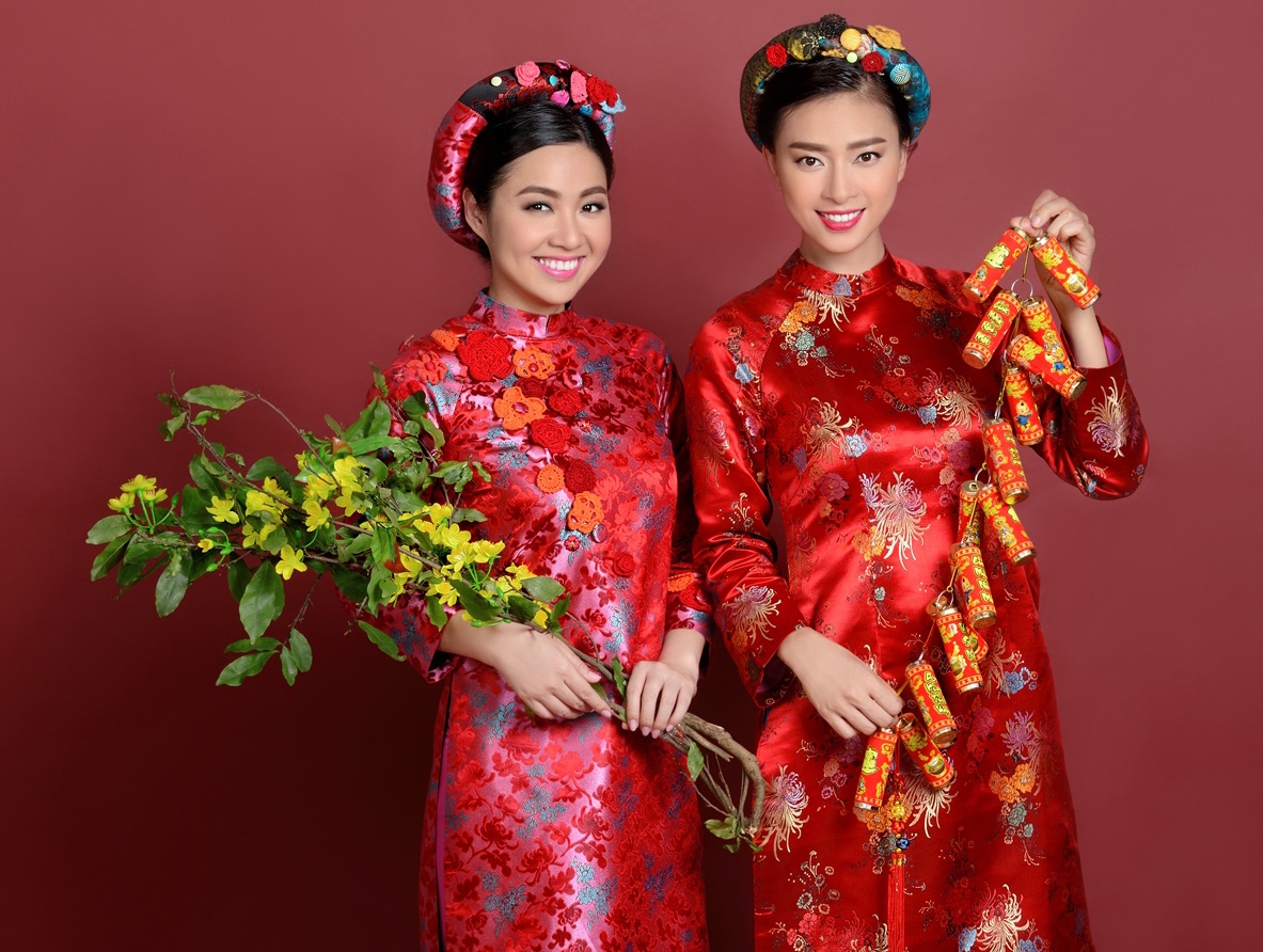 "Đả nữ" điện ảnh Việt cùng Lê Khánh duyên dáng trong mẫu áo dài gấm họa tiết truyền thống thực hiện bộ ảnh xuân 2015.
