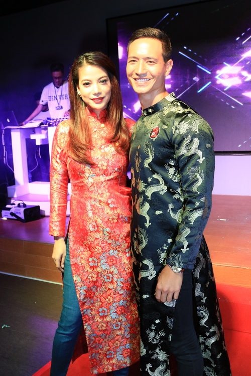 | Trương Ngọc Ánh và "người tình màn ảnh" - Kim Lý diện áo dài gấm hoa cổ truyền. Thiết kế hiện đại hơn nhờ cách mix cùng quần jeans tối màu. Trang phục đồng tông giúp cả hai đẹp đôi trên thảm đỏ sự kiện đầu năm 2015. |