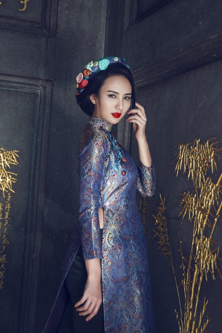 | Andrea cũng sở hữu mẫu áo dài gấm tinh tế và hiện đại. Gam màu xanh da trời trẻ trung hợp lứa tuổi. Họa tiết được làm đơn giản ăn nhập cùng kiểu dáng cách tân. |