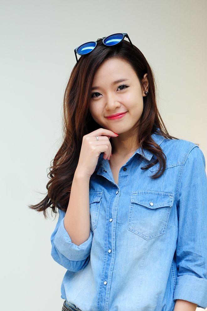 | Midu đẹp trẻ trung, năng động trong trang phục denim và mái tóc nâu uốn xoăn hiện đại. Nữ diễn viên Thiên mệnh anh hùng cho biết cô rất kỹ tính trong việc chọn dầu gội để giữ cho tóc khỏe mạnh. |