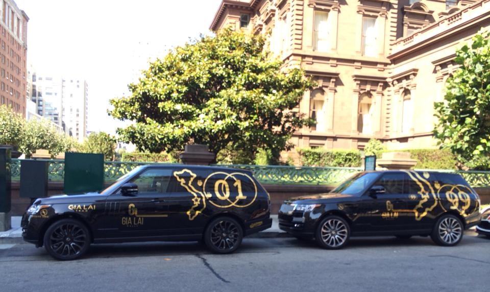 | Cặp đôi xe sang Land Rover Range Rover với một chiếc mang số thứ tự 01 dẫn đoàn. |