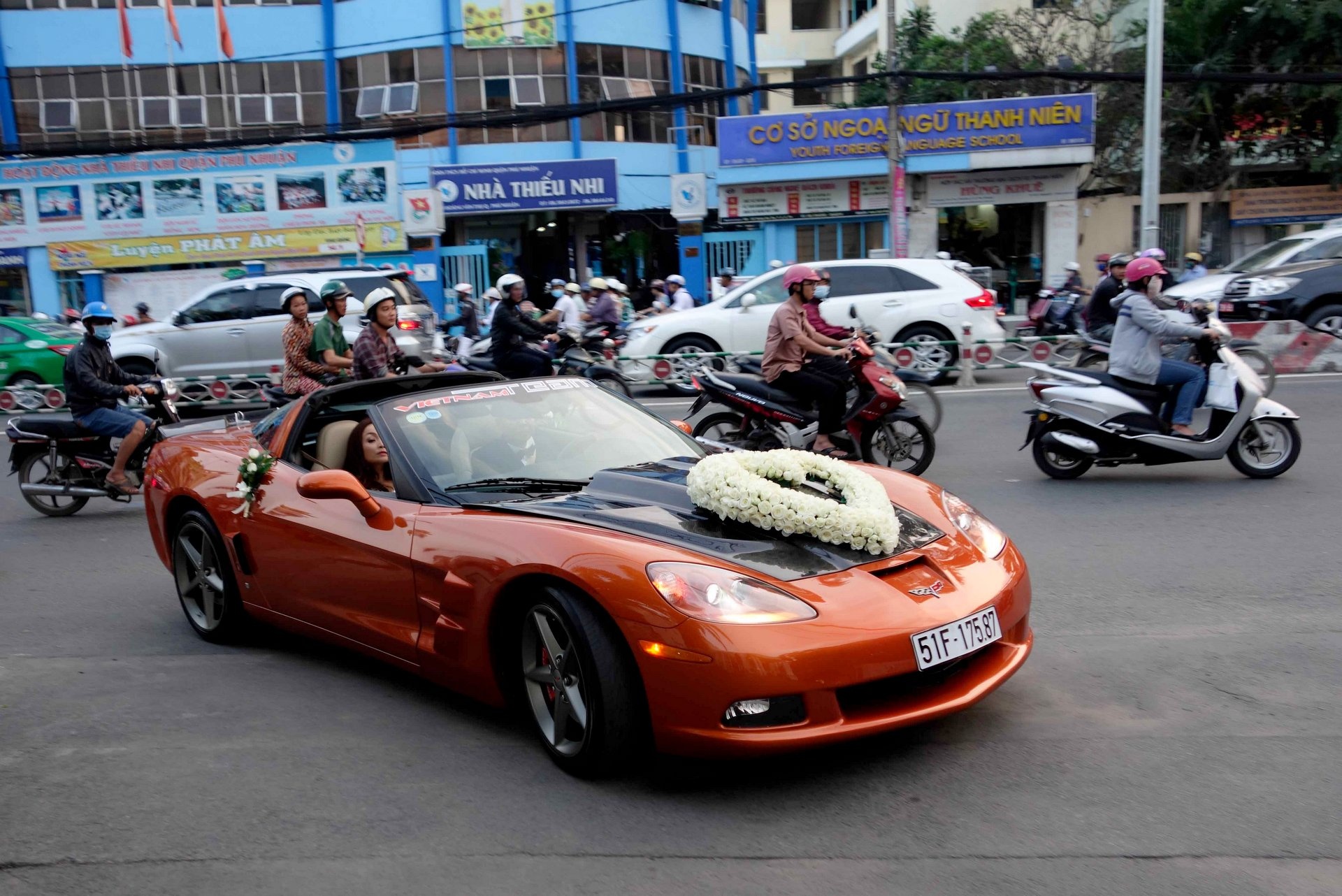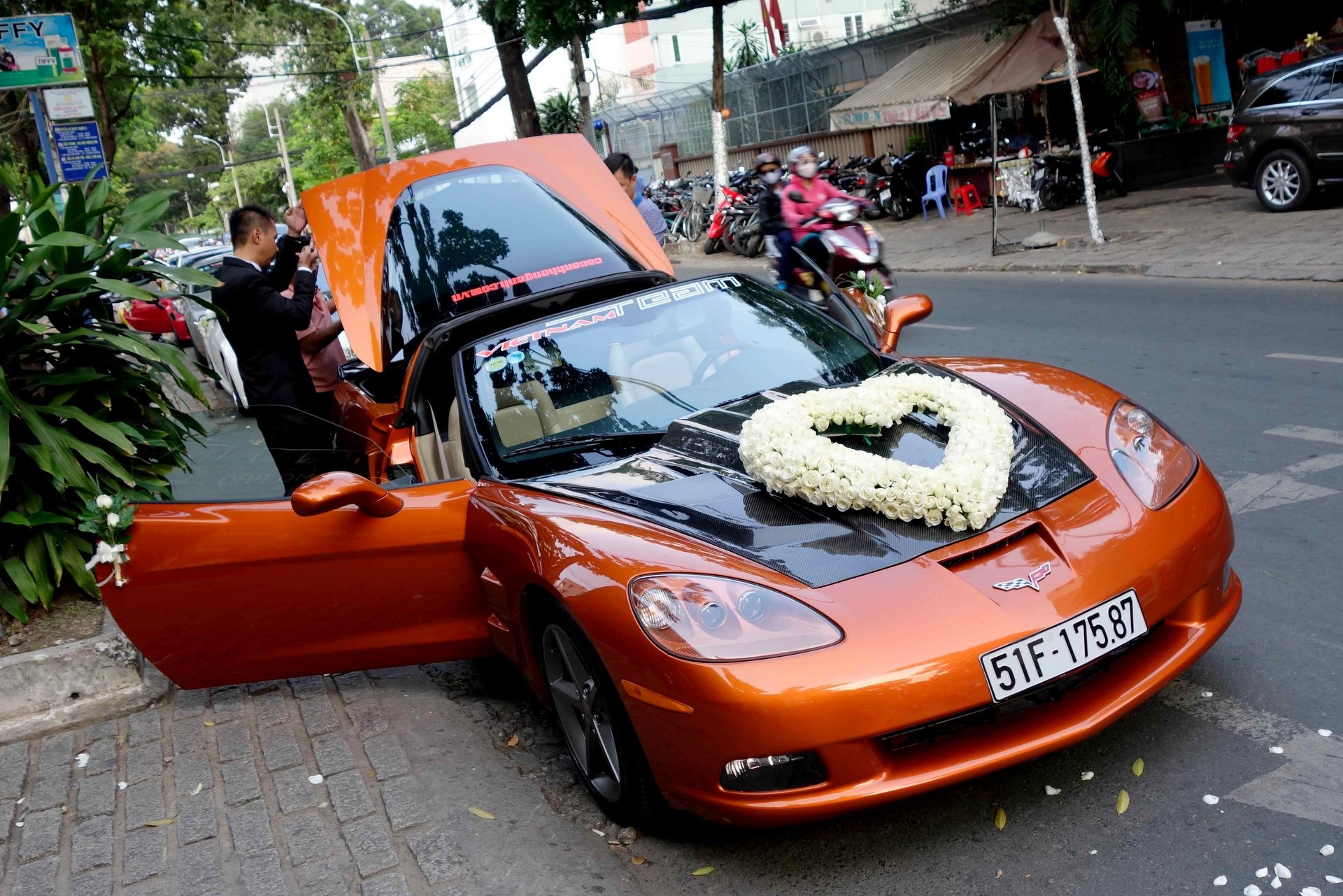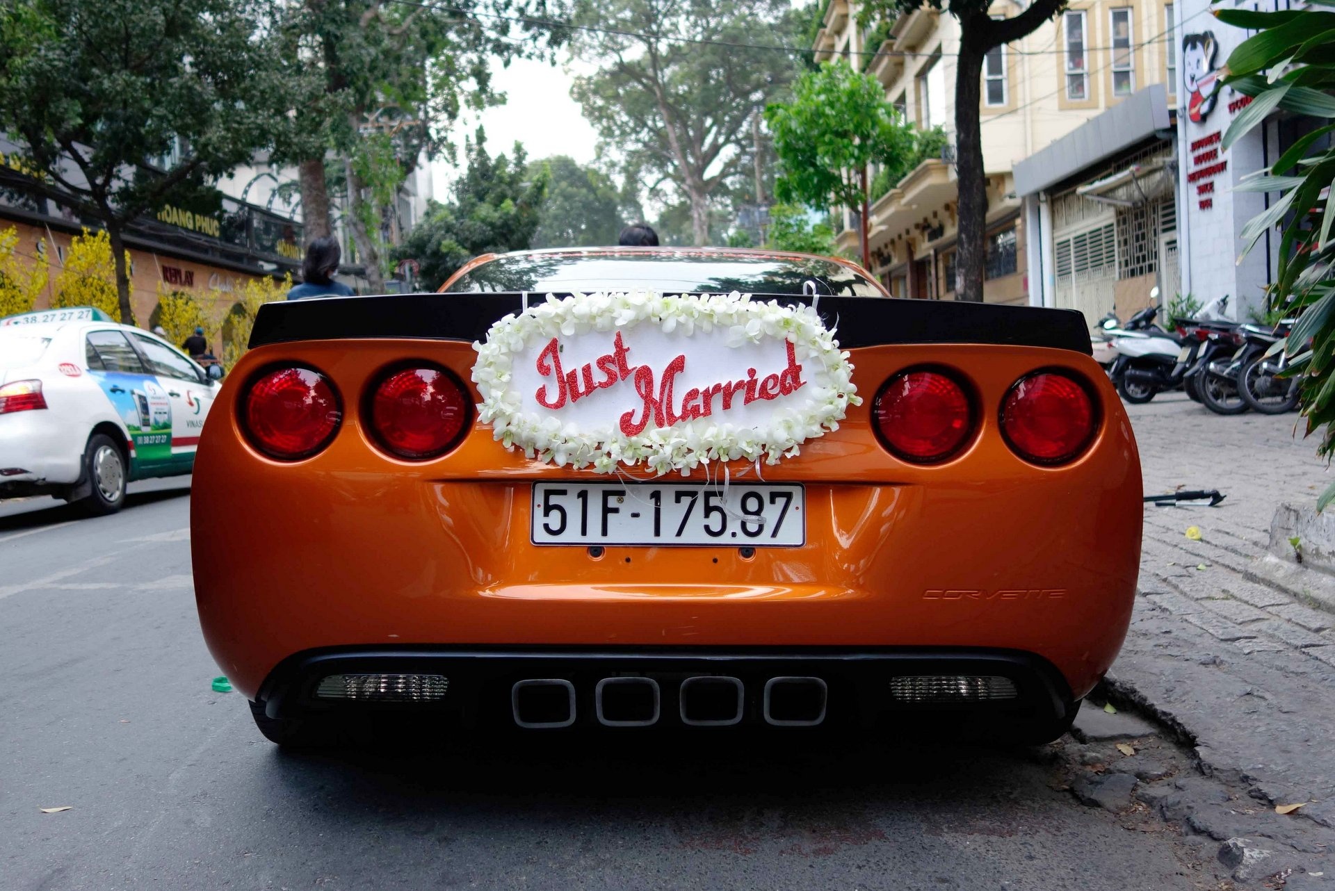 Chú rể trực tiếp lái chiếc xe cơ bắp Corvette C6 chở cô dâu. Dòng xe này có ưu điểm là nóc mui có thể tháo rời tạo thành xe mui trần, khá phù hợp để làm xe dâu.