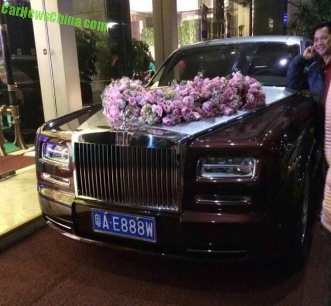| Mẫu sedan siêu sang Rolls-Royce Phantom được dùng làm xe dành cho cô dâu chú rể, trang trí bằng dải hoa cưới màu hồng. |