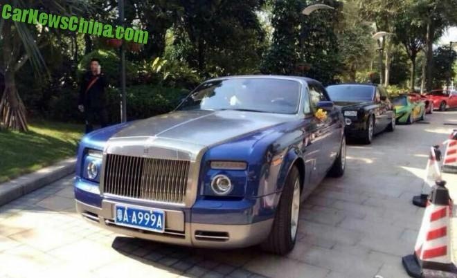 | Ngoài ra trong đoàn xe cưới còn có 1 chiếc xe mui trần siêu sang Phantom Drophead Coupe màu sơn xanh pha bạc và một chiếc sedan Phantom màu đen khác. |