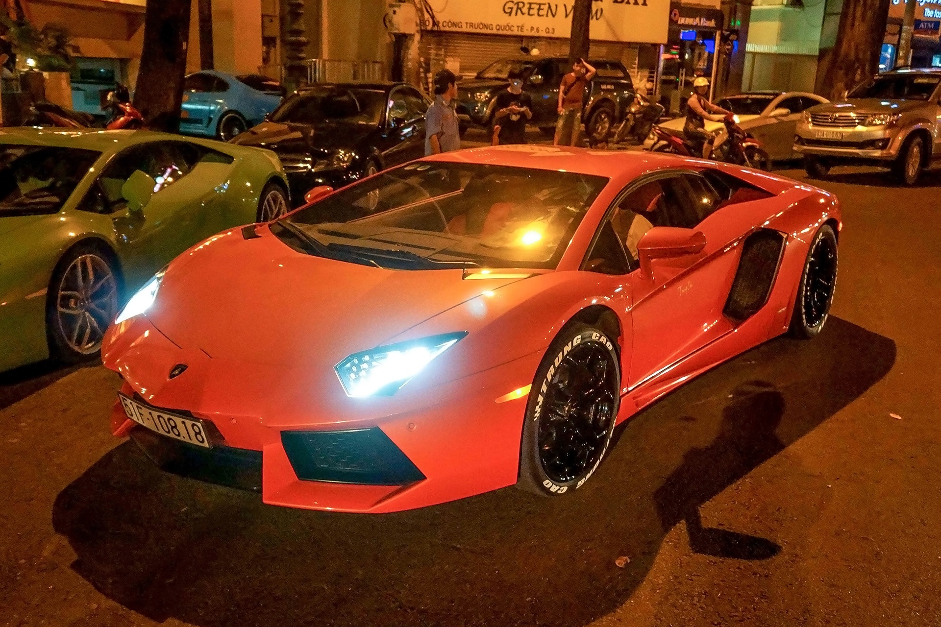 | Siêu xe Lamborghini Aventador màu cam cũng góp mặt trong tối 18/9. Tại Việt Nam hiện chỉ có 2 siêu xe Avnentador đã có chủ. Chủ nhân của siêu xe này là một người chơi xe có tiếng tại Sài Gòn với bộ sưu tập nhiều siêu xe đắt giá. |