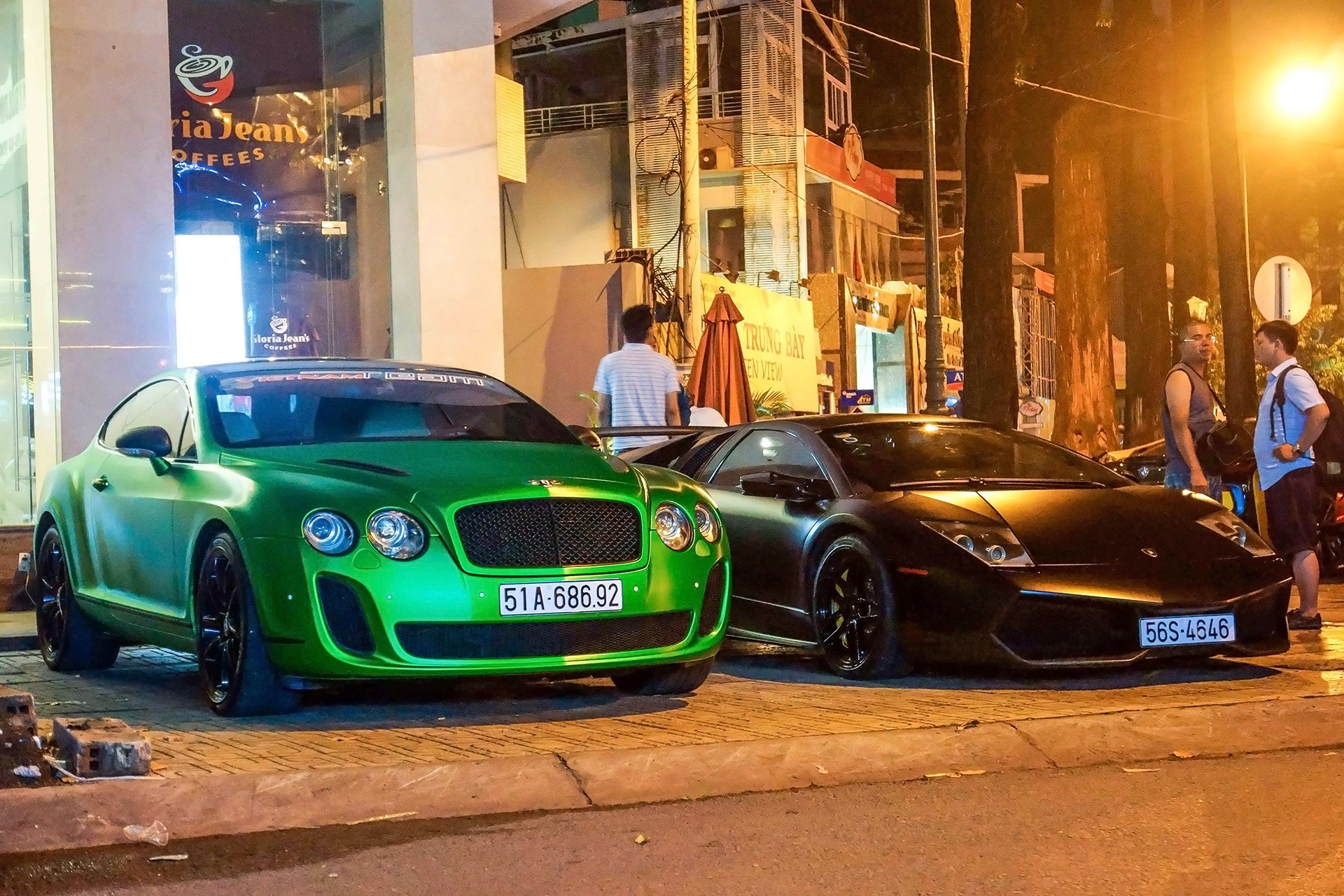 | Bentley Continental GT được chủ xe sơn tông màu xanh lá rất lạ mắt đỗ kế bên siêu xe Lamborghini Murcielago SV. |