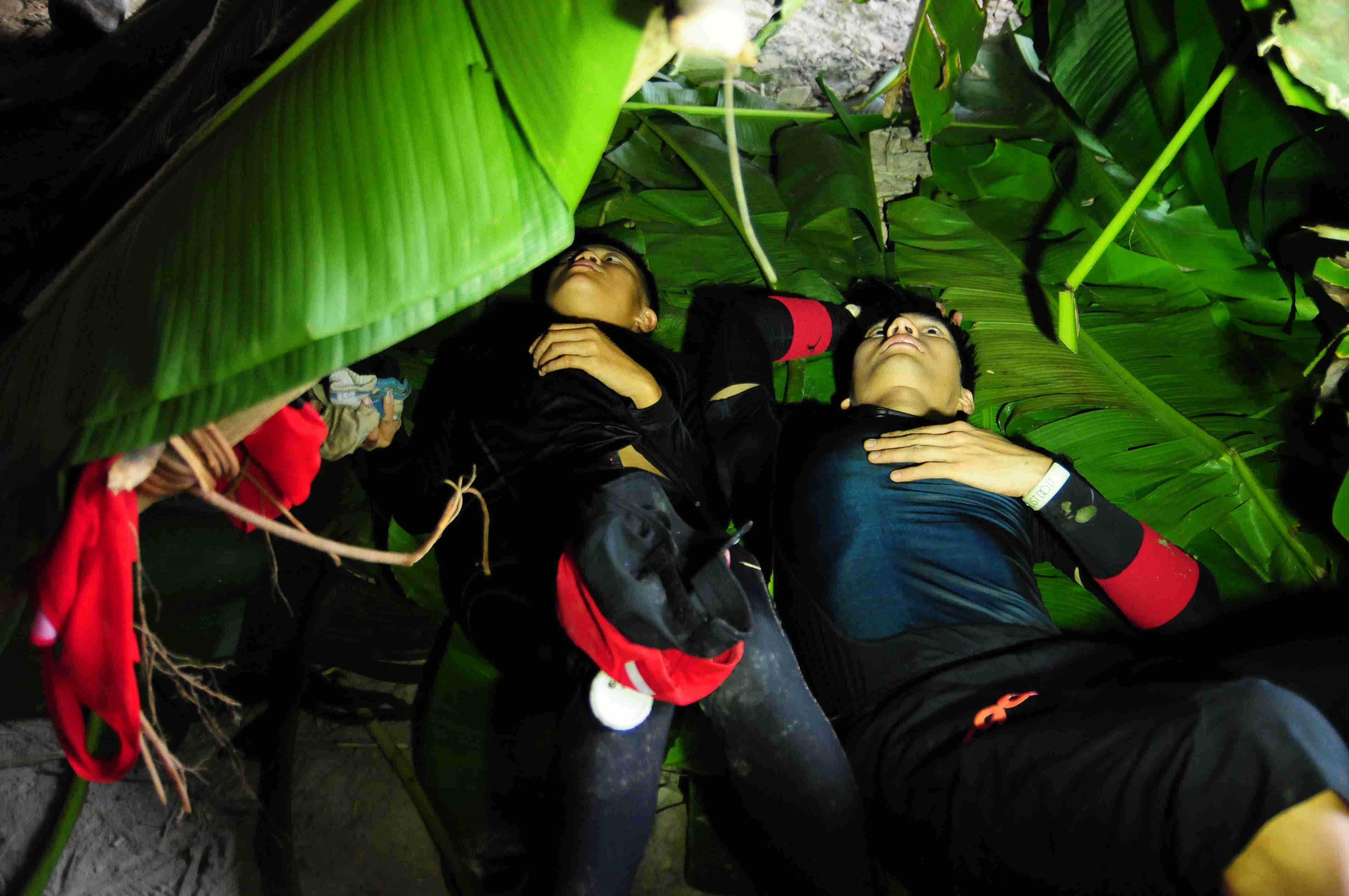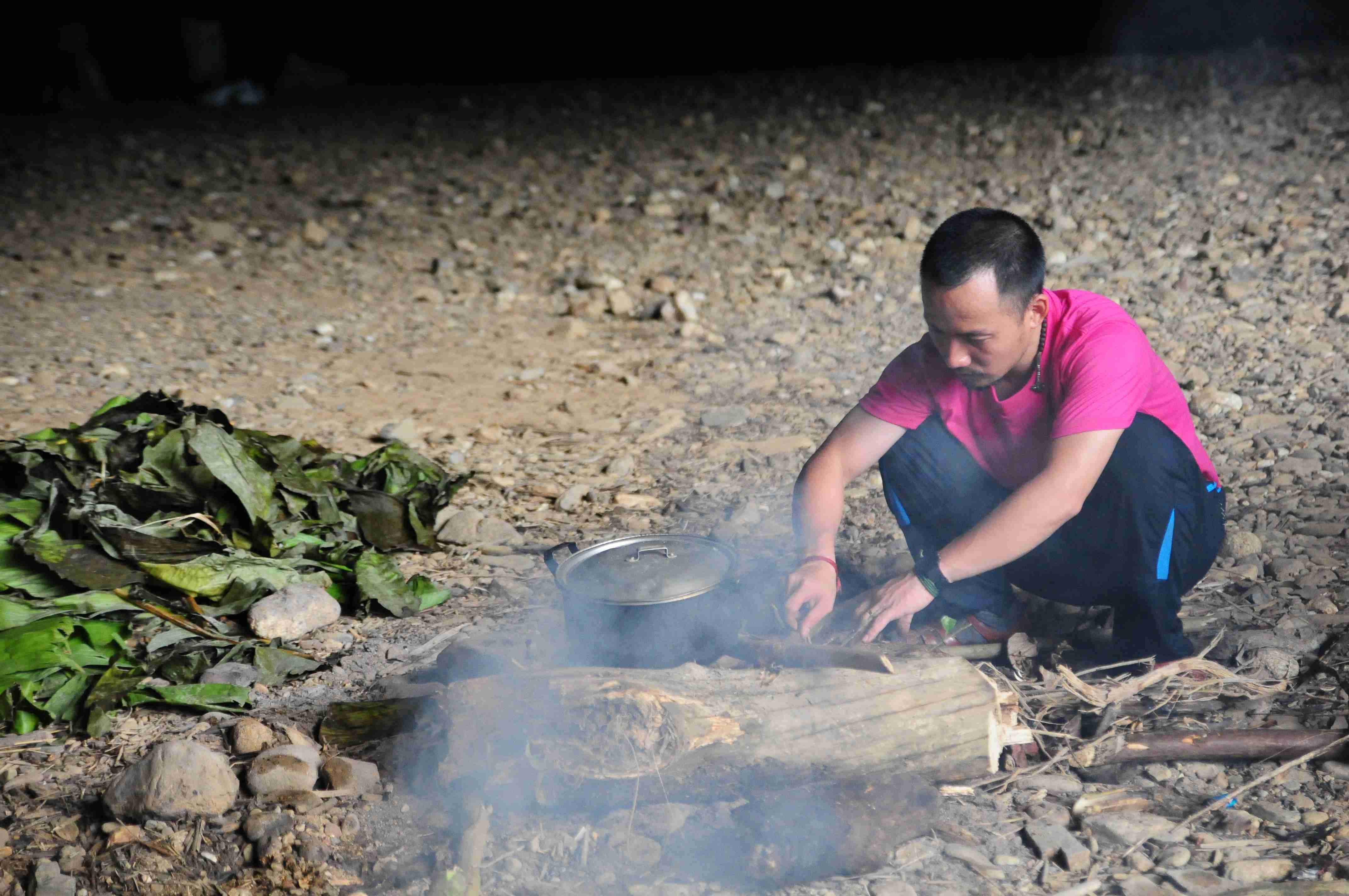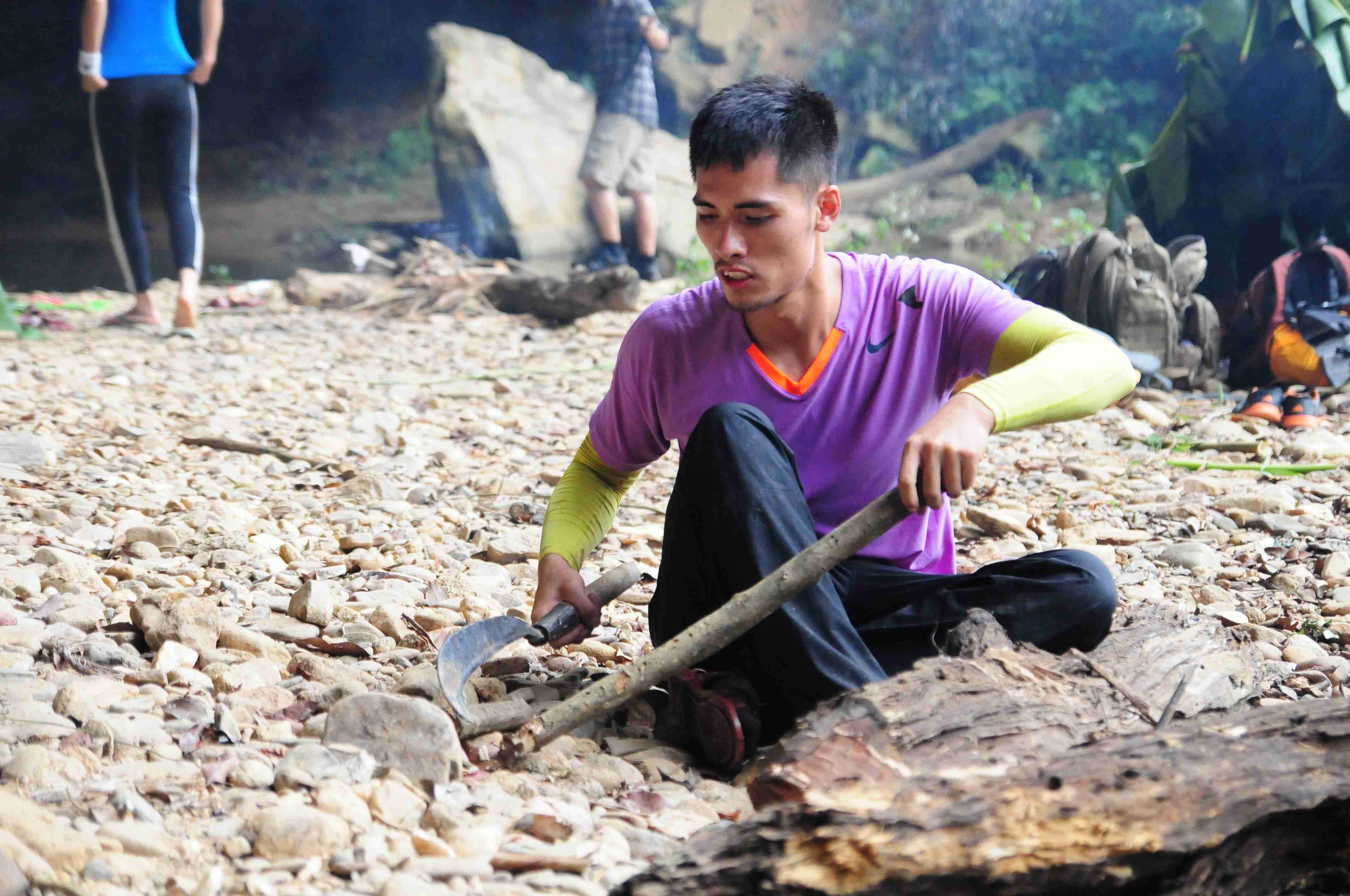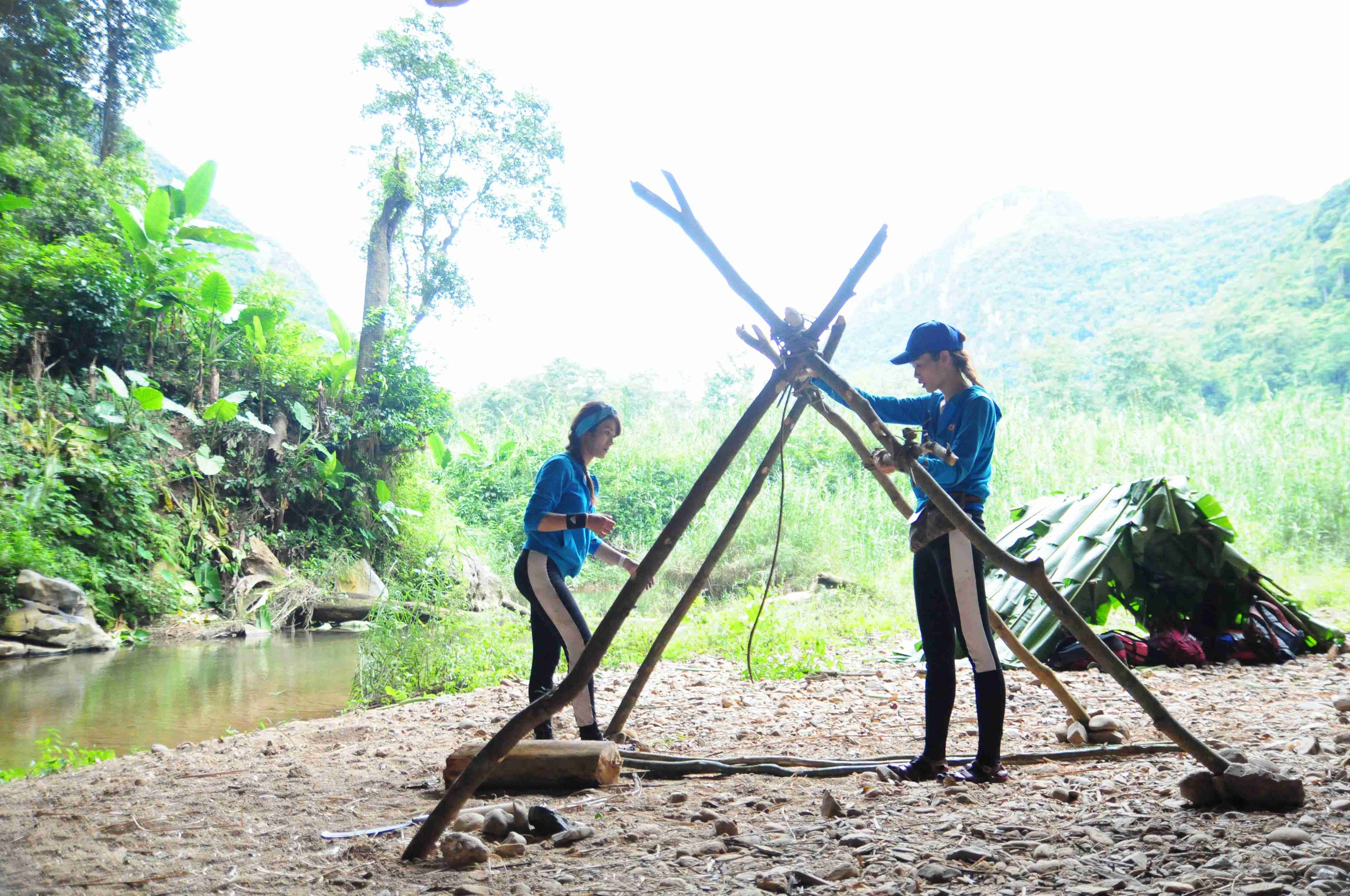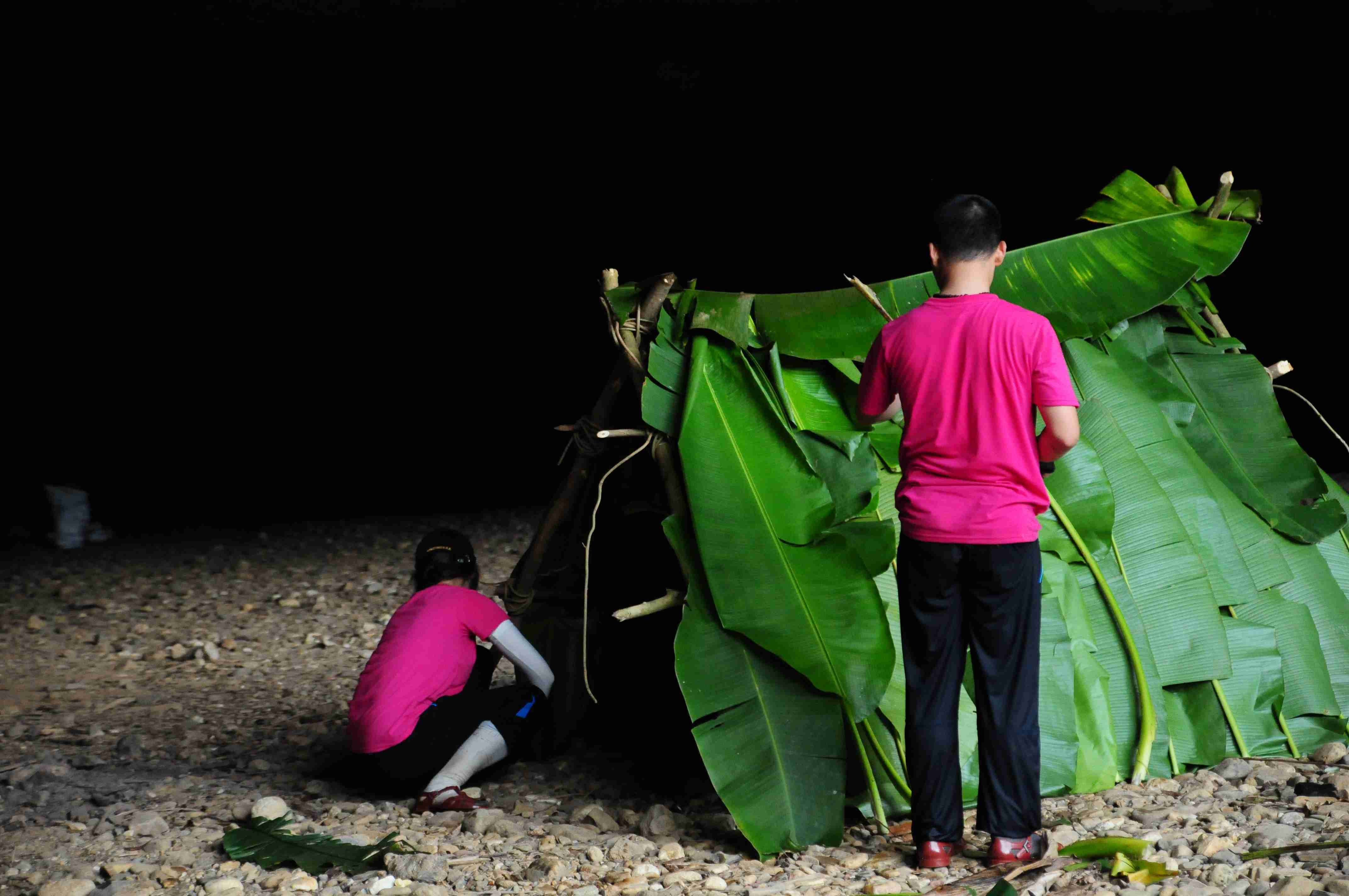Họ phải dựng một căn lều từ các cành cây và lá chuối để ngủ qua đêm, sau đó, phải tự nhóm lửa để nấu chín nước đổ đầy vào một bình 5 lít.