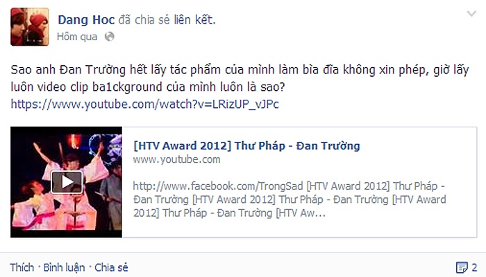 Vì không muốn sự việc thêm ồn ào, anh đã quyết định im lặng cho qua. Đến tối 17/2 vừa rồi, trong lúc lên mạng để xem các phần trình diễn ca khúc Thư pháp của một số ca sĩ nhằm rút kinh nghiệm trước lúc thu âm lại, Đăng Học đã vô tình bắt gặp clip trình diễn của Đan Trường ở HTV Award 2012. Điều đáng nói, trong tiết mục này, ca sĩ Đan Trường tiếp tục tự ý lấy một clip do anh thực hiện để làm nền cho phần biểu diễn của mình. Quá ấm ức, Đăng Học đã đăng tải dòng chia sẻ gây chú ý trên.
