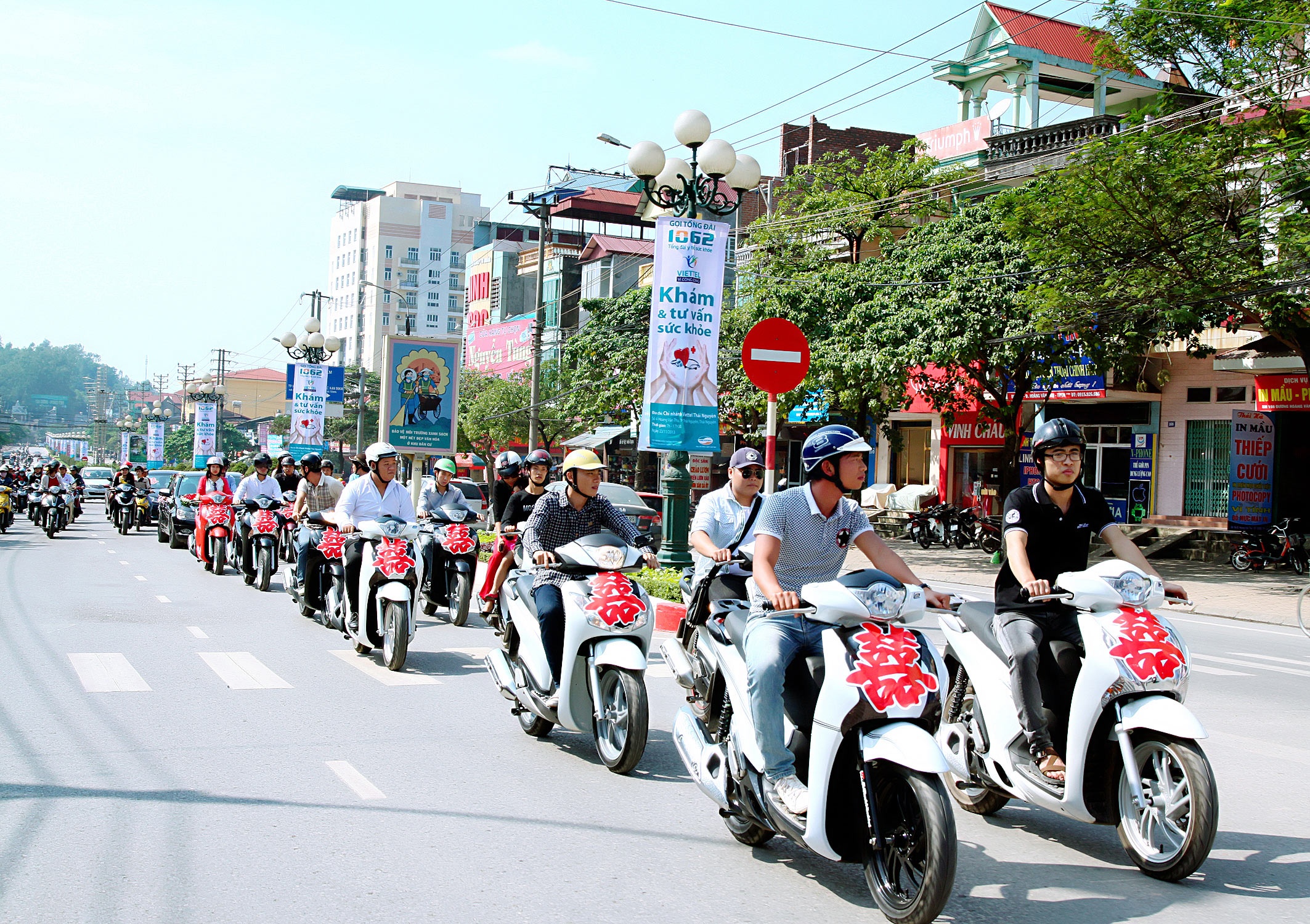 | Khoảng gần 20 chiếc Honda SH với chữ hỷ ở đầu xe trên đường đưa dâu. |