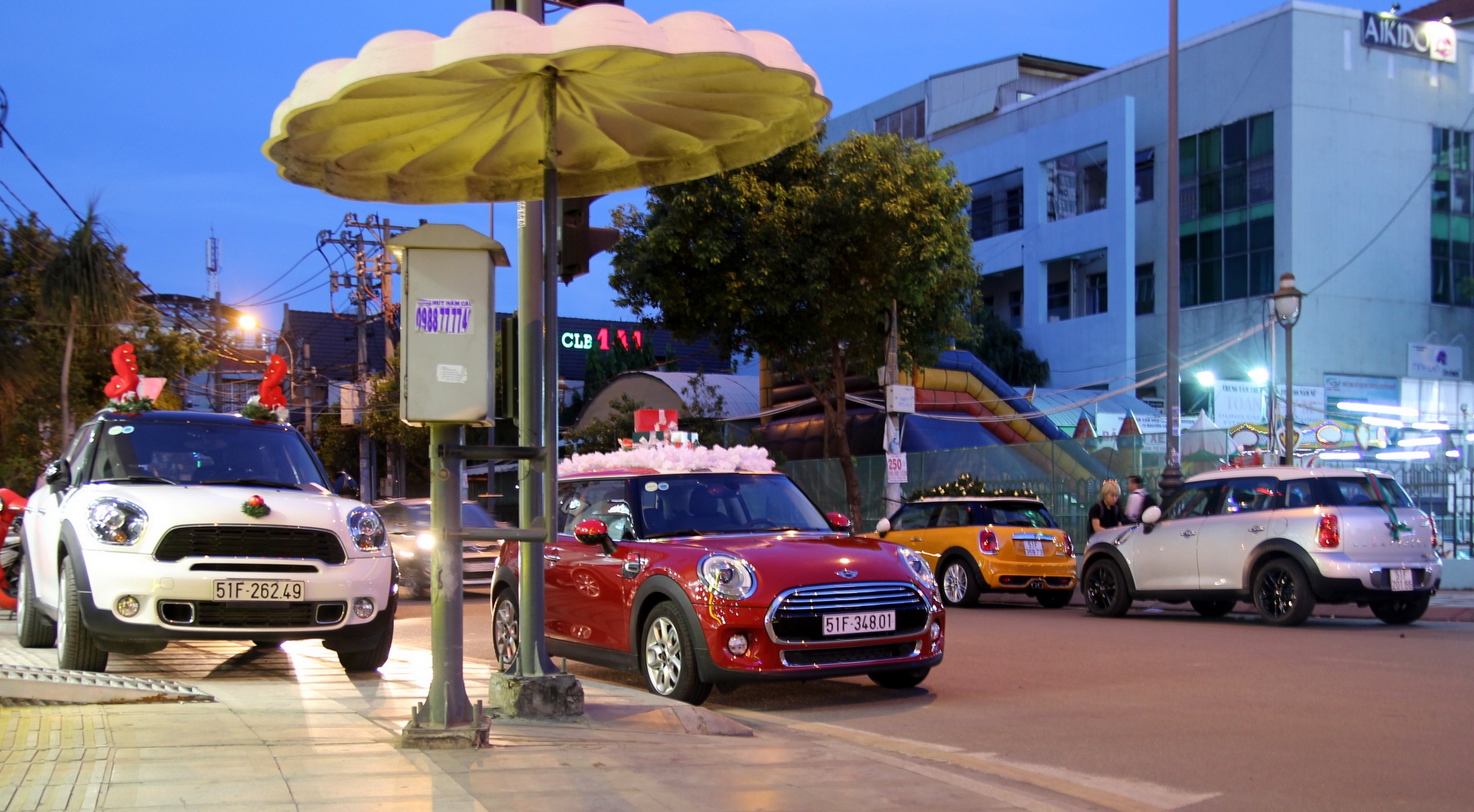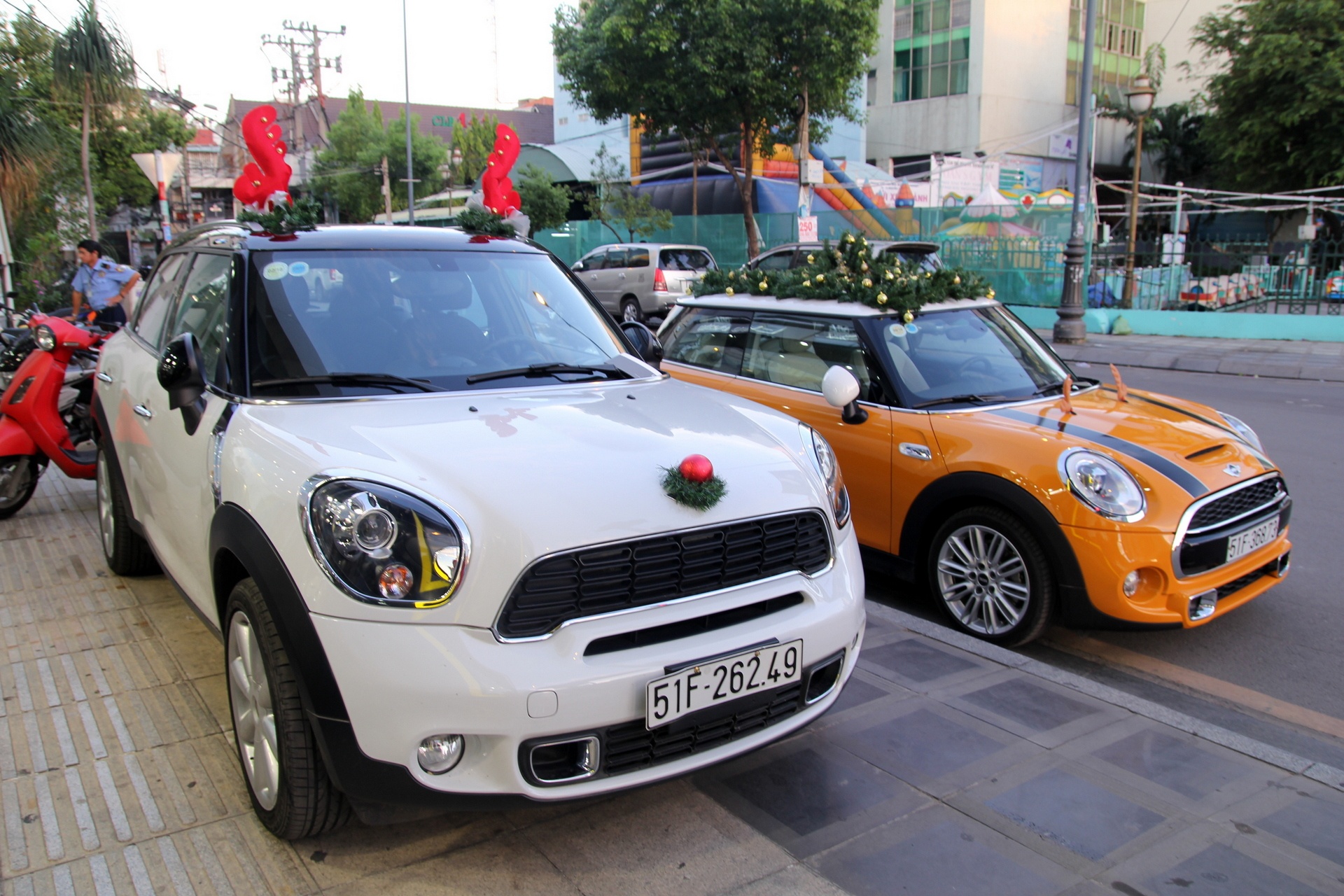 4 chiếc Mini được gắn thêm những vật trang trí mùa Noel như cây thông, hộp quà, sừng tuần lộc... thu hút sự chú ý tại TP HCM.