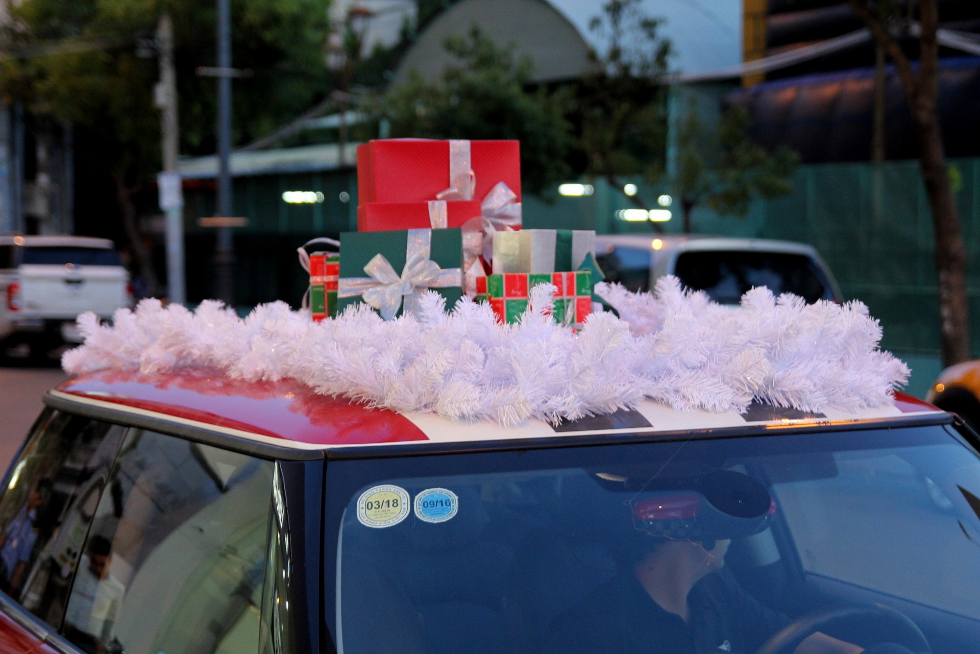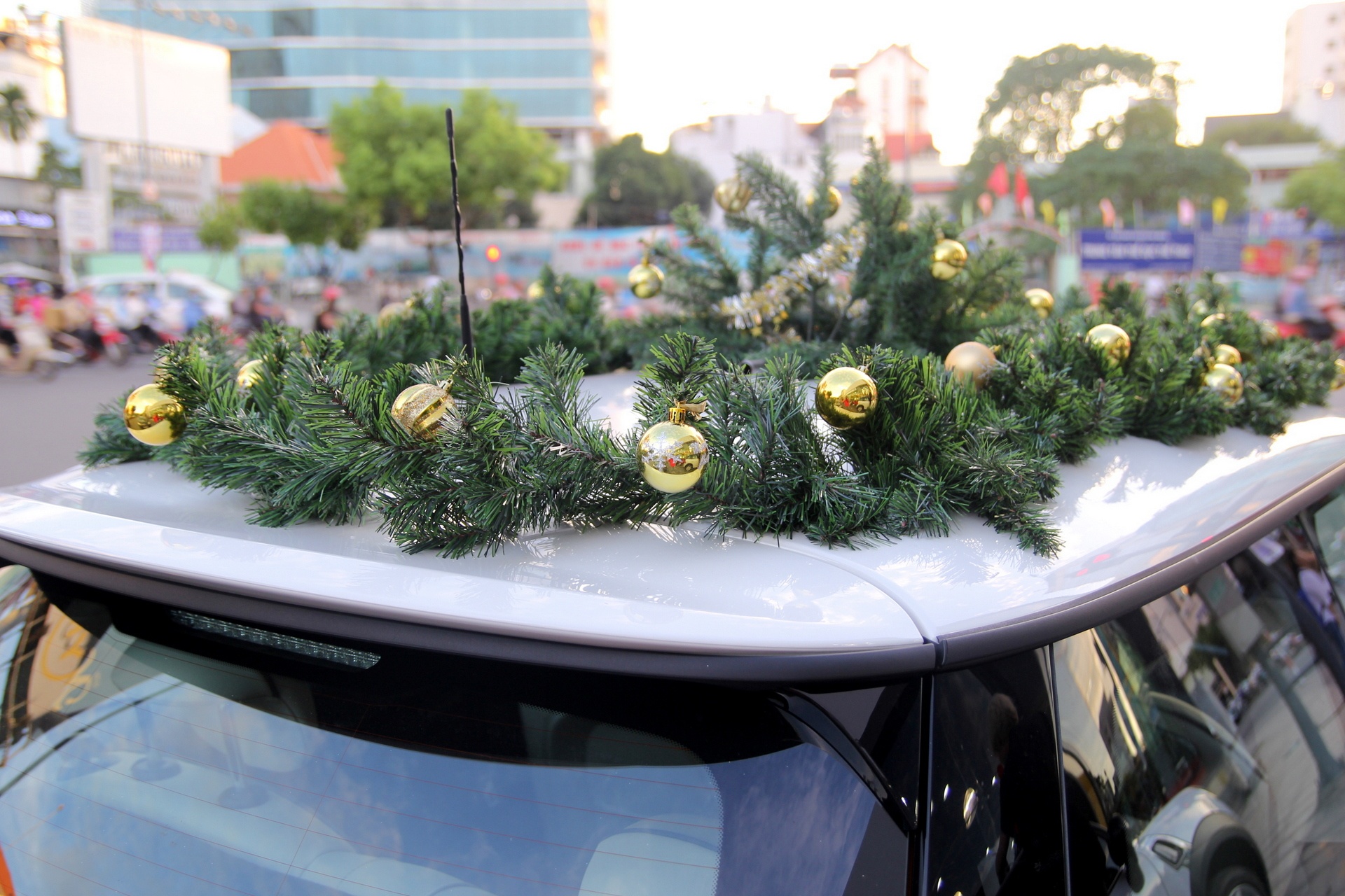 | Nóc xe được trang trí lá thông và chuông vàng, một kiểu trang trí quen thuộc mỗi mùa Giáng sinh. |