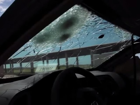 Sau khi lĩnh cả băng đạn AK-47, kính trước của xe trông như thế này. |