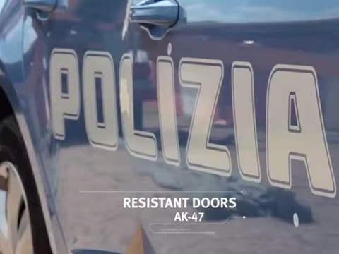 Không mô tả thêm chi tiết, nhưng cảnh sát Ý tin rằng chiếc Seat Leon thực sự có đủ điều kiện để trở thành phương tiện tuần tra hữu hiệu. Trong hình, hệ thống thử súng đang bắn thẳng vào kính trước của xe cảnh sát Ý. |