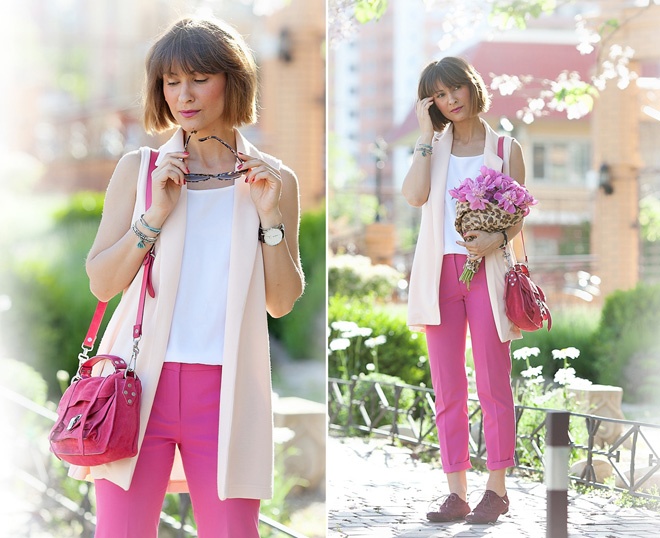 | Cũng có thể phối các gam đậm nhạt cùng tông màu, chẳng hạn như hồng pastel và hồng cánh sen. Bạn sẽ sở hữu ngay bộ cánh pastel mới lạ, cuốn hút. |