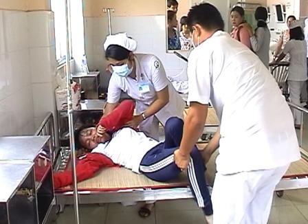| Một em ngất xỉu đang được các bác sĩ chăm sóc. Ảnh Báo Đồng Tháp. |