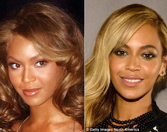 | Beyonce (trái) vào năm 2004 với đôi lông mày nhọn và năm 2015 (phải), lông mày cô hình vòm dịu dàng hơn. |