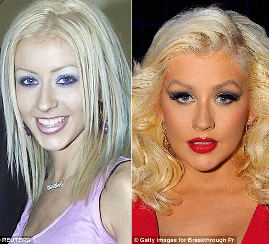| Christina Aguilera năm 2000 (ảnh trái) trong năm 2009 (ảnh phải). Cô thích tạo dáng lông mày rất nhọn. |