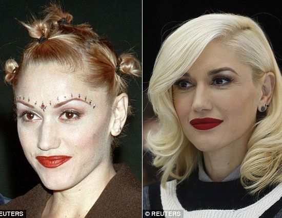 | Gwen Stefani vào năm 1997 (trái) và trong năm 2014 (phải). Dù tạo kiểu mỏng hay dày thì lông mày đều có chiều dài qua đuôi mắt. |