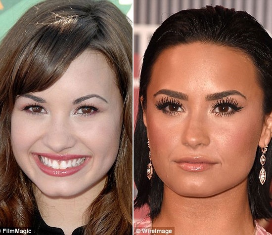 | Demi Lovato nhanh chóng cập nhập xu hướng lông mày rậm hợp với mặt vào năm 2015 (phải). Trước đó, năm 2008, lông mày cô có đầu ngắn, mỏng và cong. |