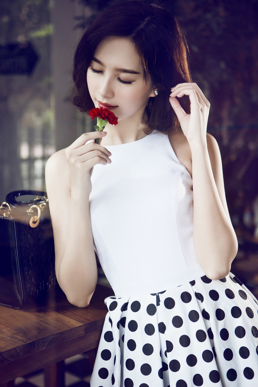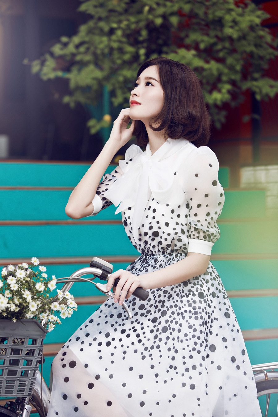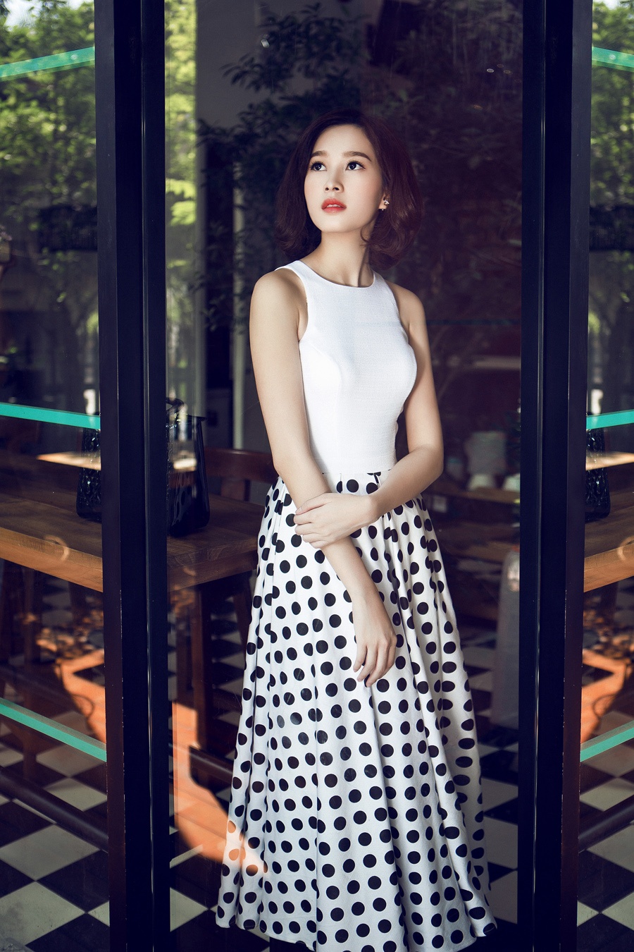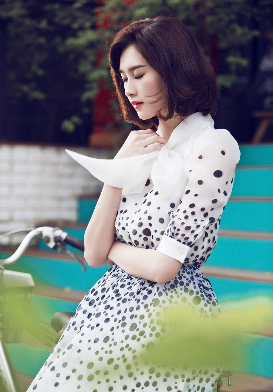 | Trang phụ trắng, điểm họa tiết chấm bi giúp hình ảnh của người mặc thêm nữ tính, dịu dàng. |