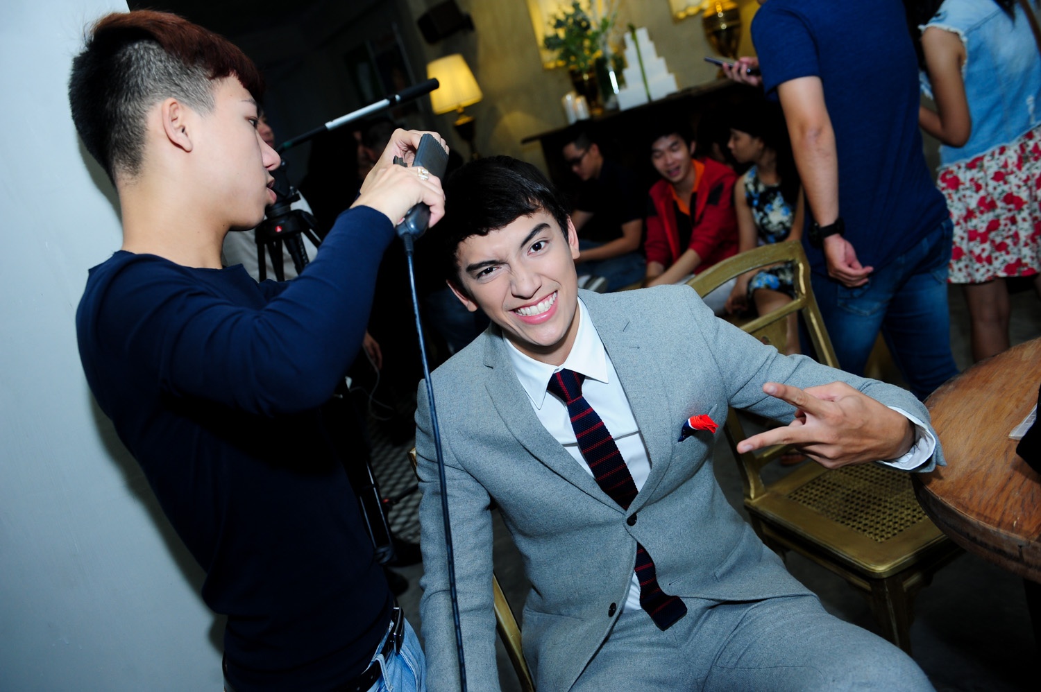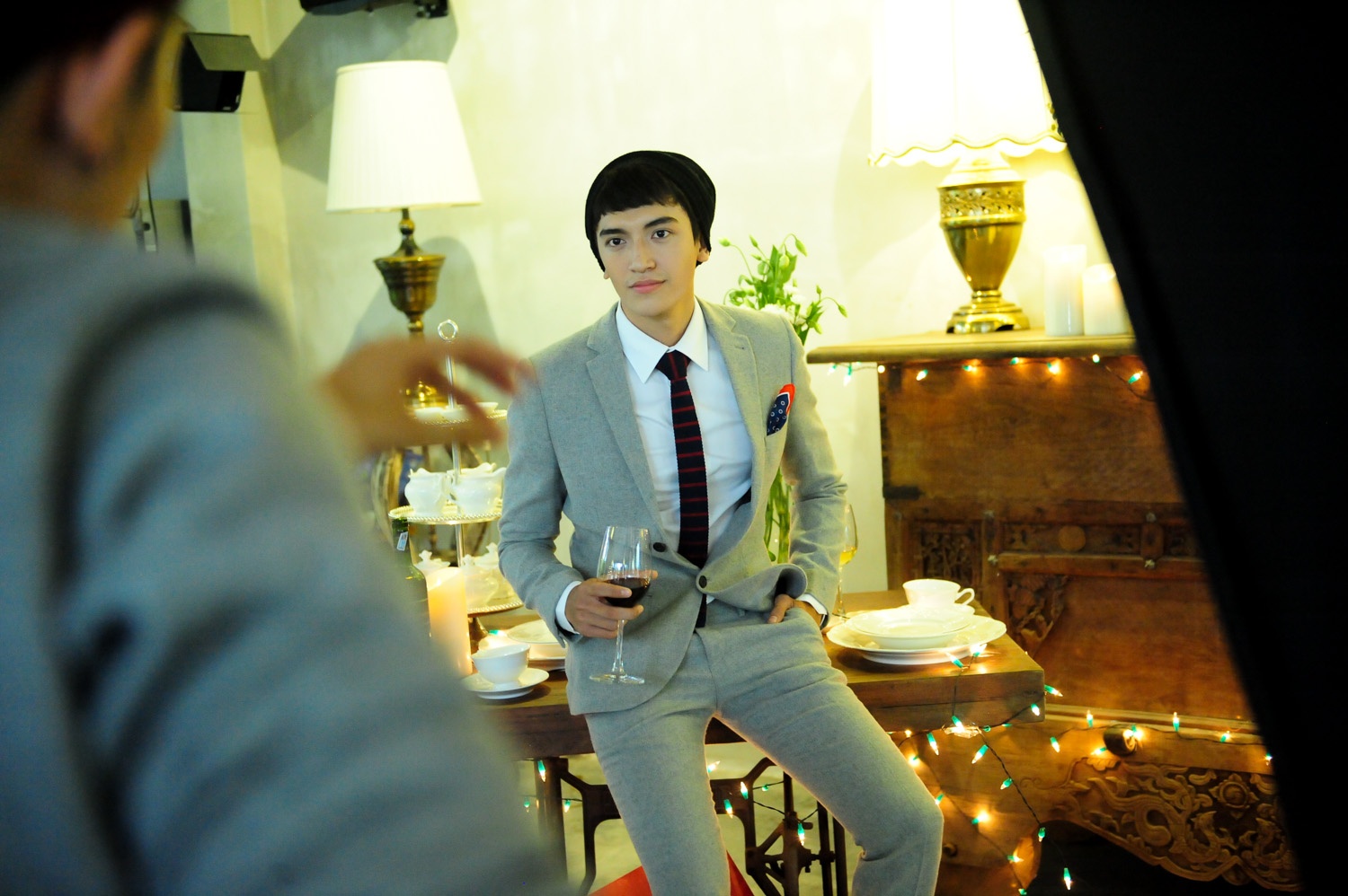 | Phía hậu trường buổi chụp, các thí sinh bận rộn với công tác chuẩn bị. Hồng Đức chọn bộ vest xám lịch lãm. Anh chàng cười đùa vui vẻ trong suốt phần thi của mình. |