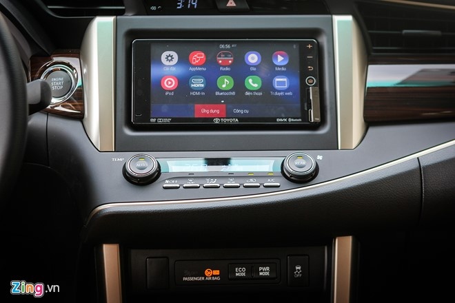 So với nhiều mẫu xe khác, Innova mới có màn hình cảm ứng lớn hơn, hiển thị dạng ngang ở giữa các bảng điều khiển. Xe cũng trang bị khóa thông minh, nhiều dải đèn mờ xanh, bàn gập ở dải ghế thứ hai bên cạnh hệ thống điều khiển không khí.