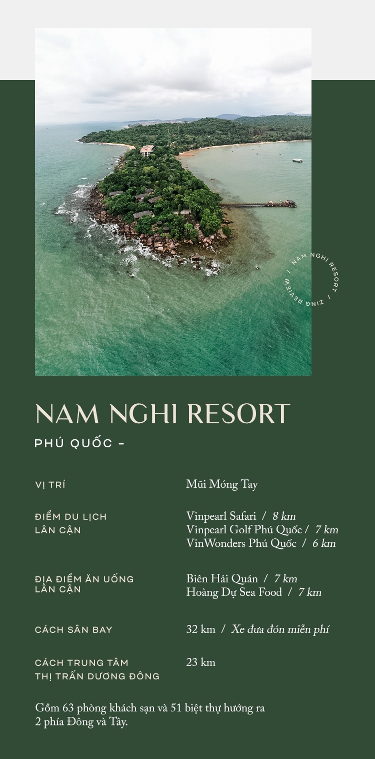 Nằm phía bắc đảo Phú Quốc, cách thị trấn Dương Đông khoảng 25 km, Nam Nghi Resort ở mũi Móng Tay là điểm dừng chân cho những ai yêu thích trải nghiệm hòa mình với thiên nhiên. Nơi lưu trú nổi bật bởi hệ sinh thái và nét đẹp hoang sơ của núi rừng nguyên sinh được bảo tồn.