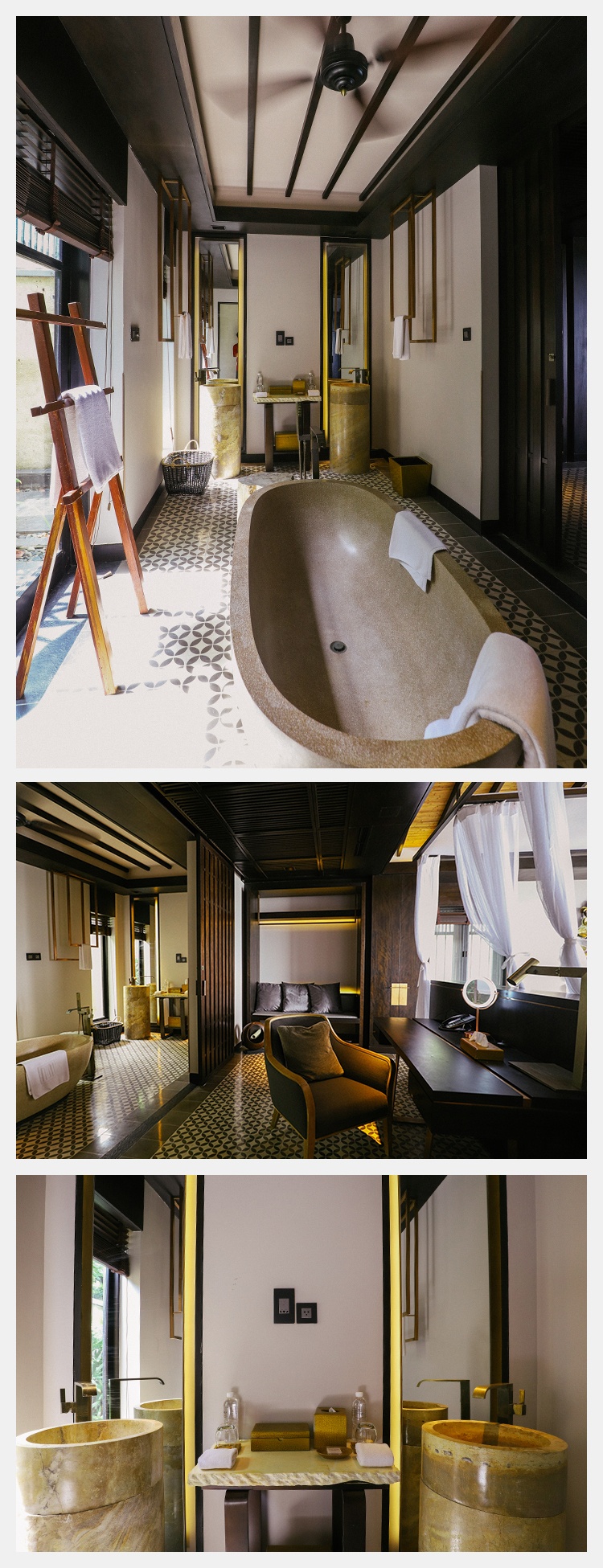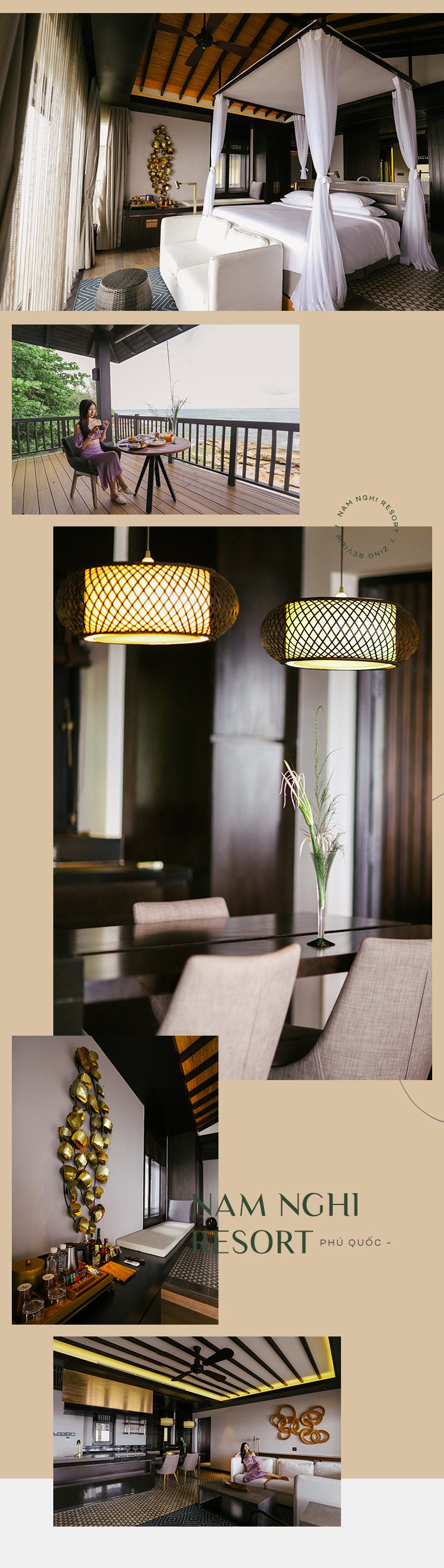 Nhận phòng khi trời còn sáng, tôi thích thú với lối kiến trúc lạ mắt chưa từng trải nghiệm trước đó. Tre và gỗ tạo không gian Á Đông trang trọng, cổ kính. Ánh sáng chủ yếu lấy từ các khung cửa sổ kính lớn. Chỉ cần tựa mình vào ban công, tôi có thể hít đầy lồng ngực mùi của biển, lắng nghe sóng vỗ dưới chân mình.