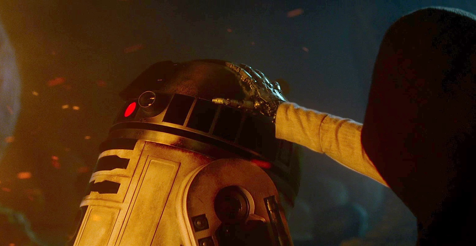 | Nhân vật bí ẩn với cánh tay sắt đặt lên đầu R2-D2 rất có thể chính là Luke Skywalker. |