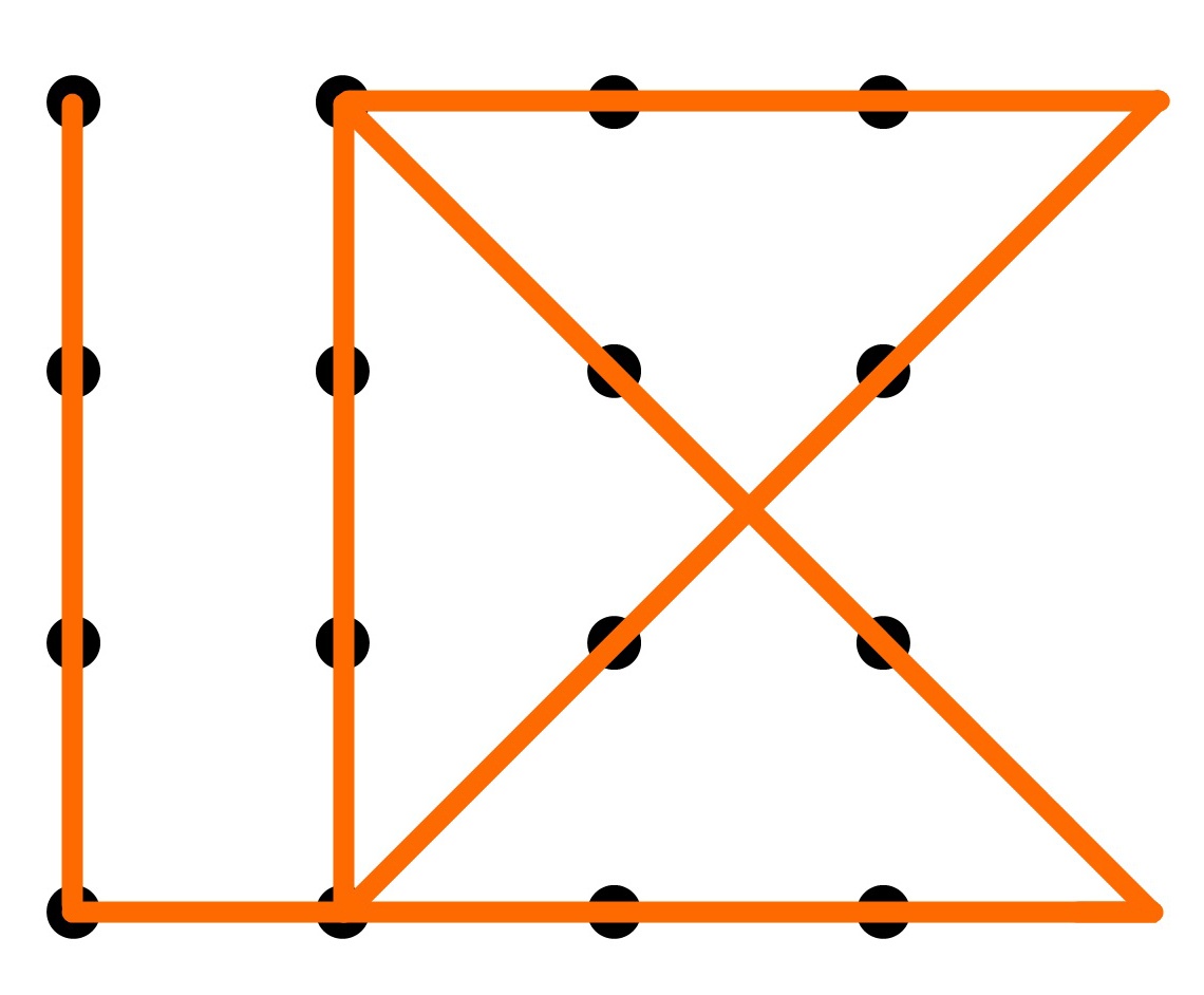 Mặc dù điểm cuối cùng của cột thứ hai bị đi qua hai lần nhưng không đoạn thẳng nào trùng nhau. Như vậy, bạn cần ít nhất 6 đoạn thẳng để nối 16 điểm bằng một nét bút.
