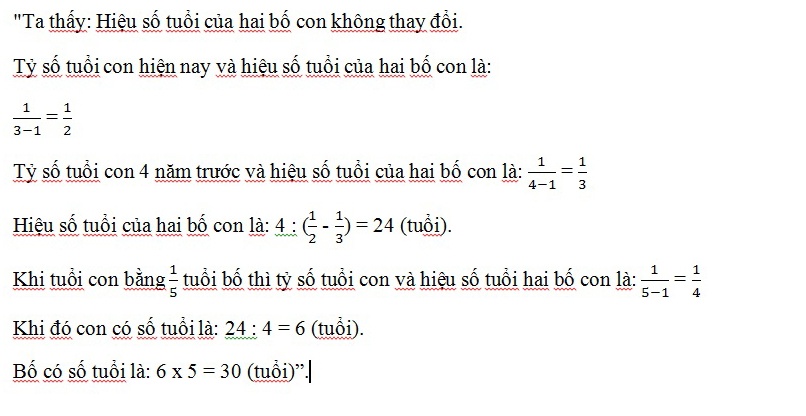 Đề bài như sau: "Biết hiện nay tuổi bố gấp 3 lần tuổi con và cách đây 4 năm thì tuổi bố gấp 4 lần tuổi con. Hỏi khi tuổi bố gấp 5 lần tuổi con, con sẽ bao nhiêu tuổi và bố bao nhiêu tuổi?".