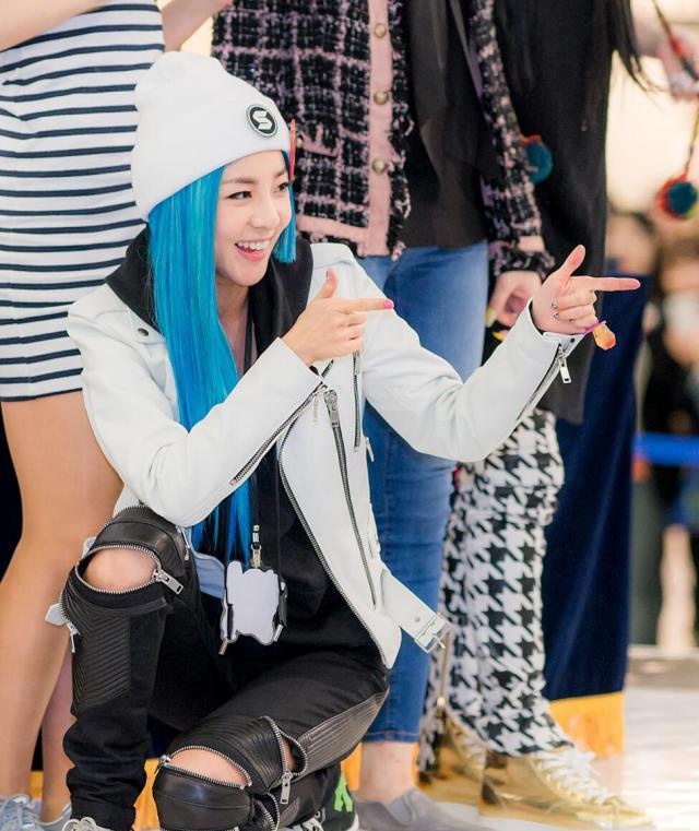 | Dara nổi bật với ngoại hình tóc xanh lệch bên như trong MV. |