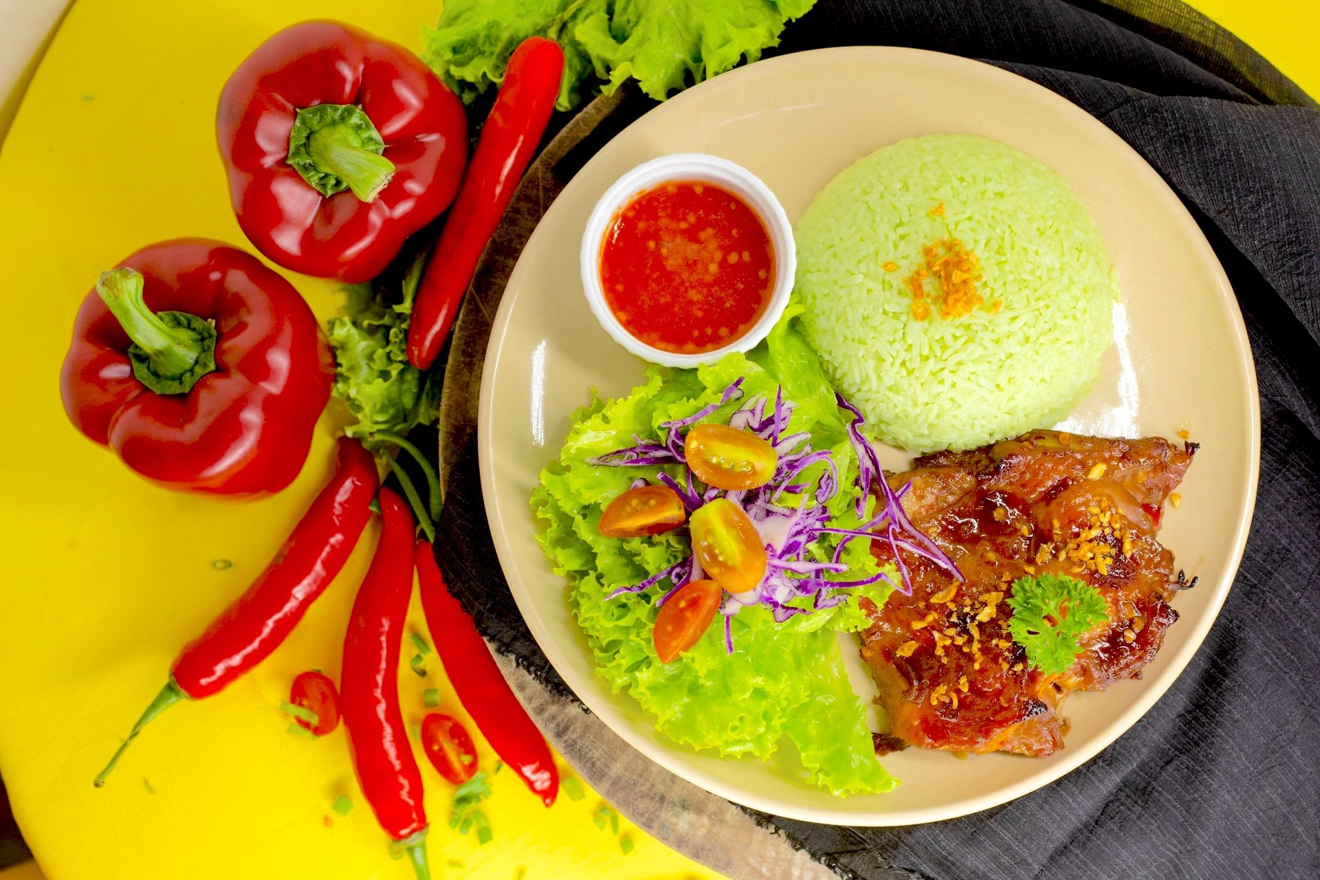 Phần cơm nóng với miếng thịt gà mềm, nước chấm chuẩn vị luôn hấp dẫn nhiều thực khách. Tiệm ăn phục vụ món cơm mang màu xanh từ lá dứa đẹp mắt, lạ miệng này phù hợp để bạn đặt bữa trưa hoặc tối. Khẩu phần còn có gà nhúng sốt, salad trộn giấm, canh.