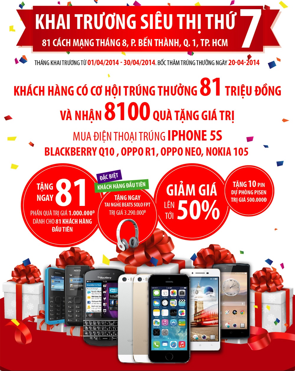 Hệ thống siêu thị di động TechOne triển khai chương trình mừng khai trương siêu thị thứ 7 tại 81 Cách Mạng Tháng Tám, Q.1, TP.Hồ Chí Minh với rất nhiều ưu đãi, giảm giá lớn, tặng iPhone 5S, điện thoại OPPO, Blackberry Q10…
