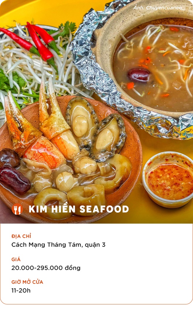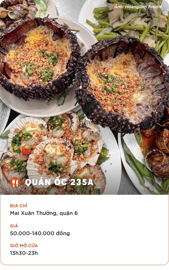 Tín đồ mê hải sản sẽ có cơ hội thỏa mãn vị giác khi đặt món tại tiệm ăn đậm chất đường phố này. Bạn có thể trải nghiệm nhum nướng vốn nổi tiếng ở Phú Quốc (Kiên Giang) hay ốc vú nàng, đặc sản của Côn Đảo (Bà Rịa - Vũng Tàu).