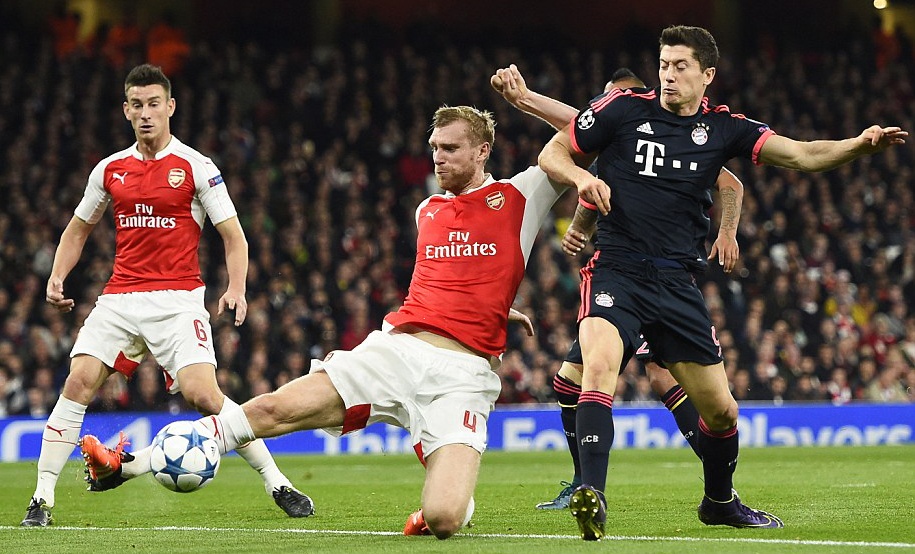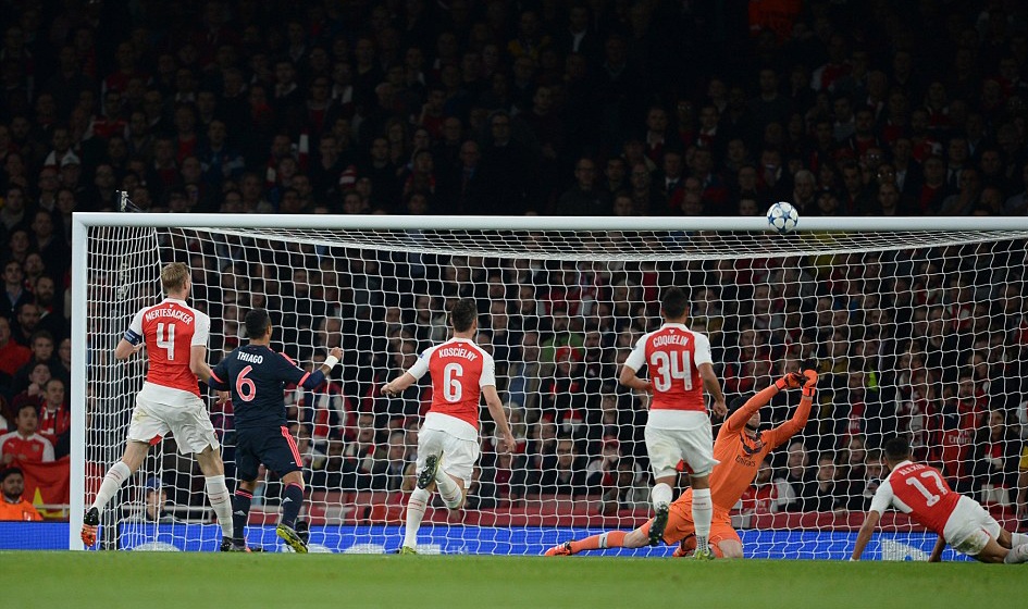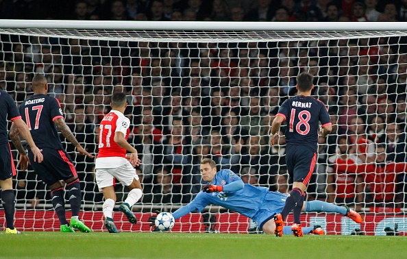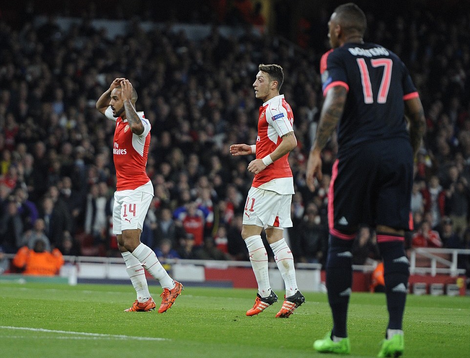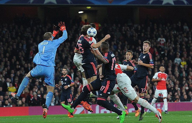 Sau đường chuyền vào bên cánh trái của đồng đội, Theo Walcott đánh đầu cận thành trong tư thế không bị kèm, nhưng thủ môn Neuer phản xạ xuất sắc cứu thua cho Bayern Munich.