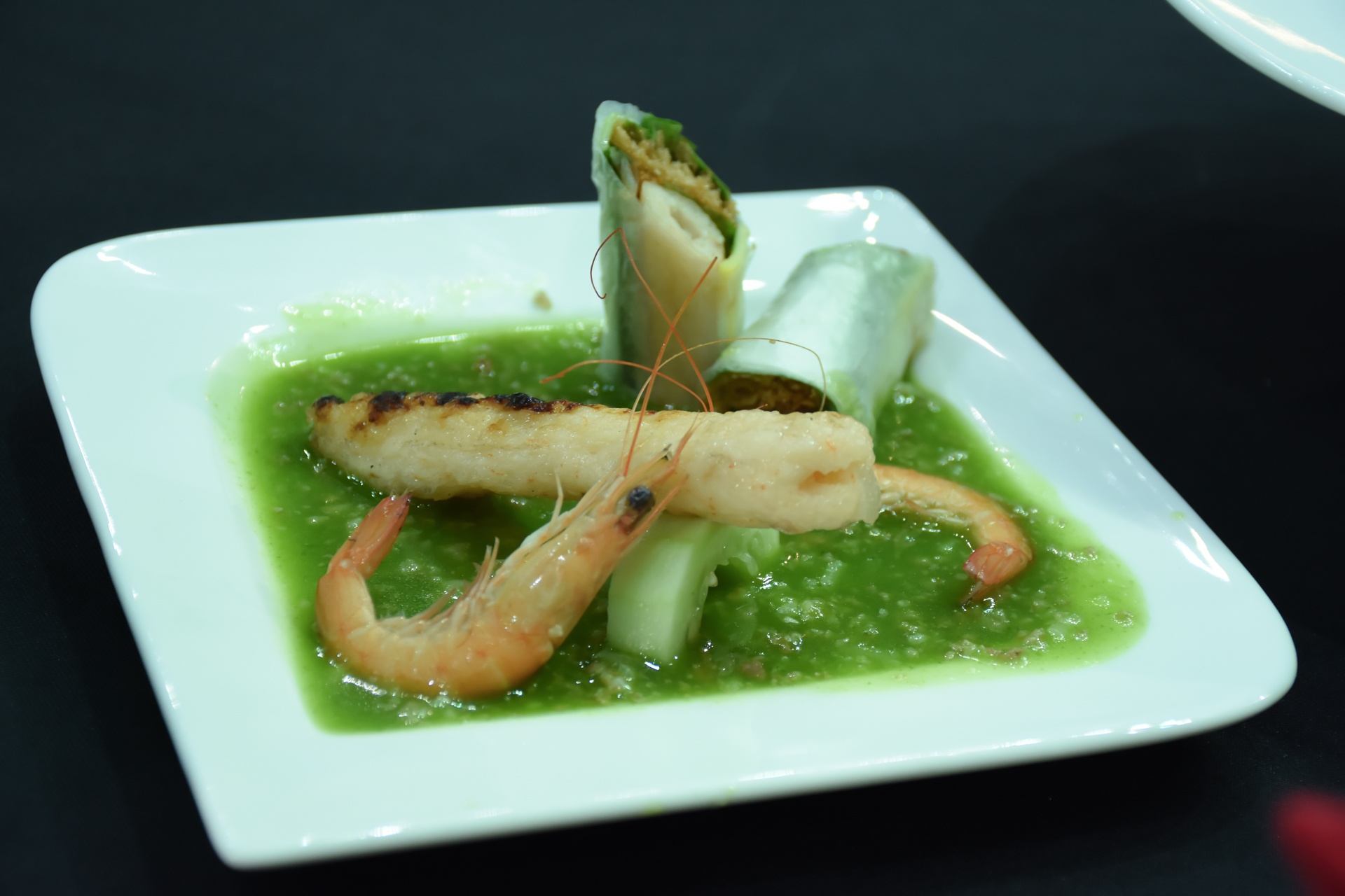 | “Cuộn nem tôm” là món được các thí sinh lấy cảm hứng từ món nem nướng đặc sản miền Trung, dùng kèm nước chấm là rễ ngò, nếp, thịt nạc xay nhuyễn.
