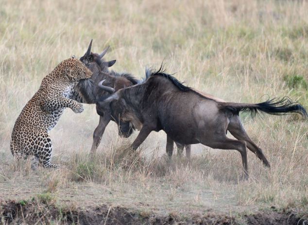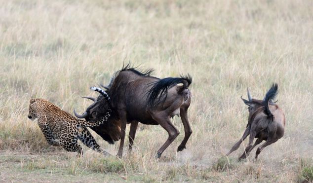 | Con báo hung dữ đói mồi cắn vào vùng cổ dê con khi dê mẹ đang lao tới. Ảnh: Martin Farrell. |