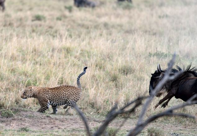 | Con báo hoảng sợ bỏ chạy. Dê mẹ tiếp tục đuổi theo. Ảnh: Martin Farrell. |