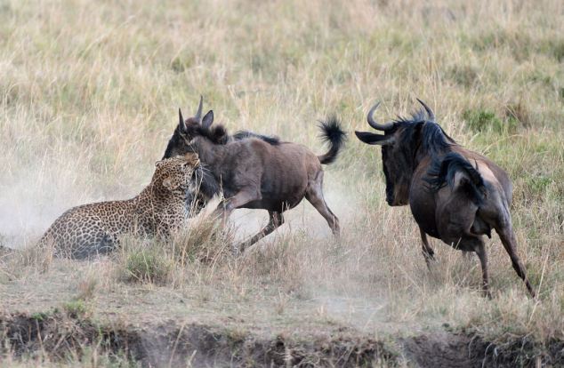 | Con báo đói mồi nhìn thấy hai mẹ con dê đang chơi đùa cùng nhau. Nó nhắm tới dê con, muốn nuốt chửng con vật. Martin Farrell đến từ Bristol (Anh) ghi lại hình ảnh cuộc săn mồi của báo trong chuyến du lịch tại Khu bảo tồn bắc Mara (Kenya). Ảnh: Martin Farrell. |
