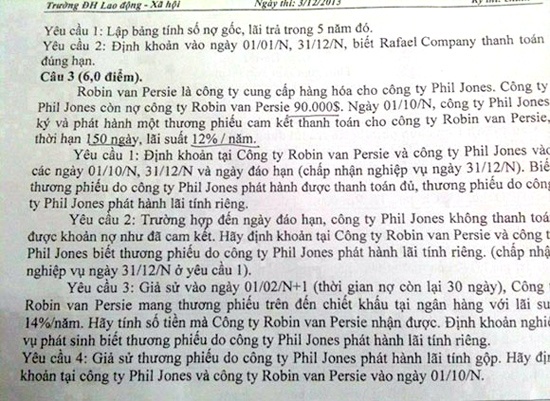 Do đặc thù của đề thi chuyên ngành kế toán nên bỗng chốc các tuyển thủ của MU lại trở thành “con buôn” trong các câu hỏi, ví dụ: "Robin Van Persie là công ty cung cấp hàng hóa cho Phil Jones. Công ty Phil Jones còn nợ công ty Robin Van Persie 90.000 USD. Ngày 1/10/N, công ty Phil Jones kí và phát hành một thương phiếu cam kết thanh toán cho công ty Robin Van Persie có thời hạn 150 ngày, lãi suất 12%/năm".