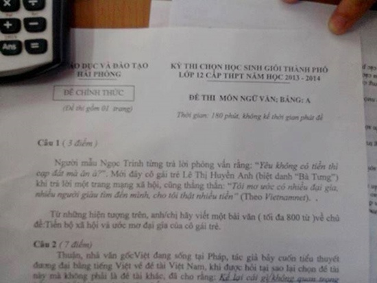 Ngày 8/10/2013, Sở GDĐT Hải Phòng tổ chức kỳ thi học sinh giỏi thành phố năm học 2013-2014. Trong đề thi môn thi Ngữ văn dành cho học sinh bảng A có câu 1 như sau “Người mẫu Ngọc Trinh từng trả lời phỏng vấn rằng “Không có thì tiền cạp đất ra mà ăn à?”. Mới đây, cô gái trẻ Lê Thị Huyền Anh (biệt danh bà Tưng) khi trả lời một trang mạng xã hội cũng thẳng thắn: “Tôi mơ ước có nhiều đại gia, nhiều người giàu tìm đến mình cho tôi thật nhiều tiền”. Từ những hiện tượng trên, anh (hay chị) hãy viết một bài văn tối đa 800 từ về chủ đề tiến bộ xã hội và ước mơ đại gia của cô gái trẻ”.