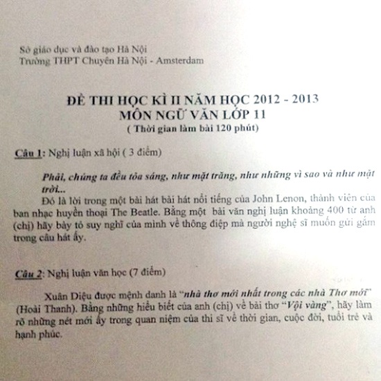 Trong đề thi học kỳ II môn Ngữ văn lớp 11 của trường THPT Chuyên Hà Nội Amsterdam có một câu hỏi ba với nội dung: "Chúng ta đều toả sáng, như mặt trăng, như những vì sao và như mặt trời...". Đó là lời trong bài hát nổi tiếng của Lennon thành viên của ban nhạc huyền thoại The Beatles thể hiện. Bằng một bài văn nghị luận khoảng 400 từ anh (chị) hãy bày tỏ suy nghĩ của mình về thông điệp mà người nghệ sĩ muốn truyền tải qua câu hát ấy.